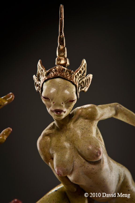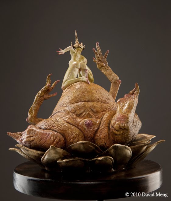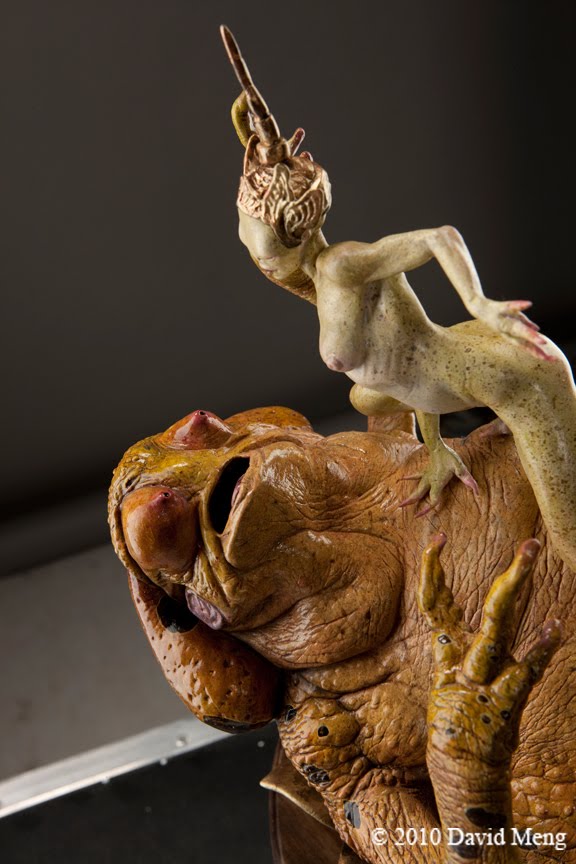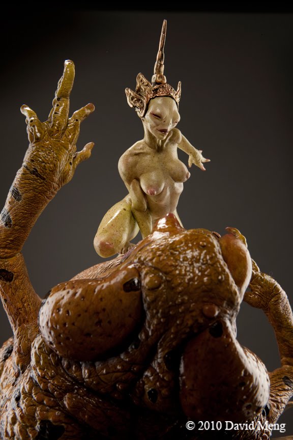 The female character on top is something I had come up with way back when, and I decided now was a good time to finally give her a three-dimensional debut. She makes a good foil for Mr. Fatty Fatty Toad Pants. The sculpture is partly a nod to Grimm's fairy tales, as frogs and toads figure very strongly in those stories.