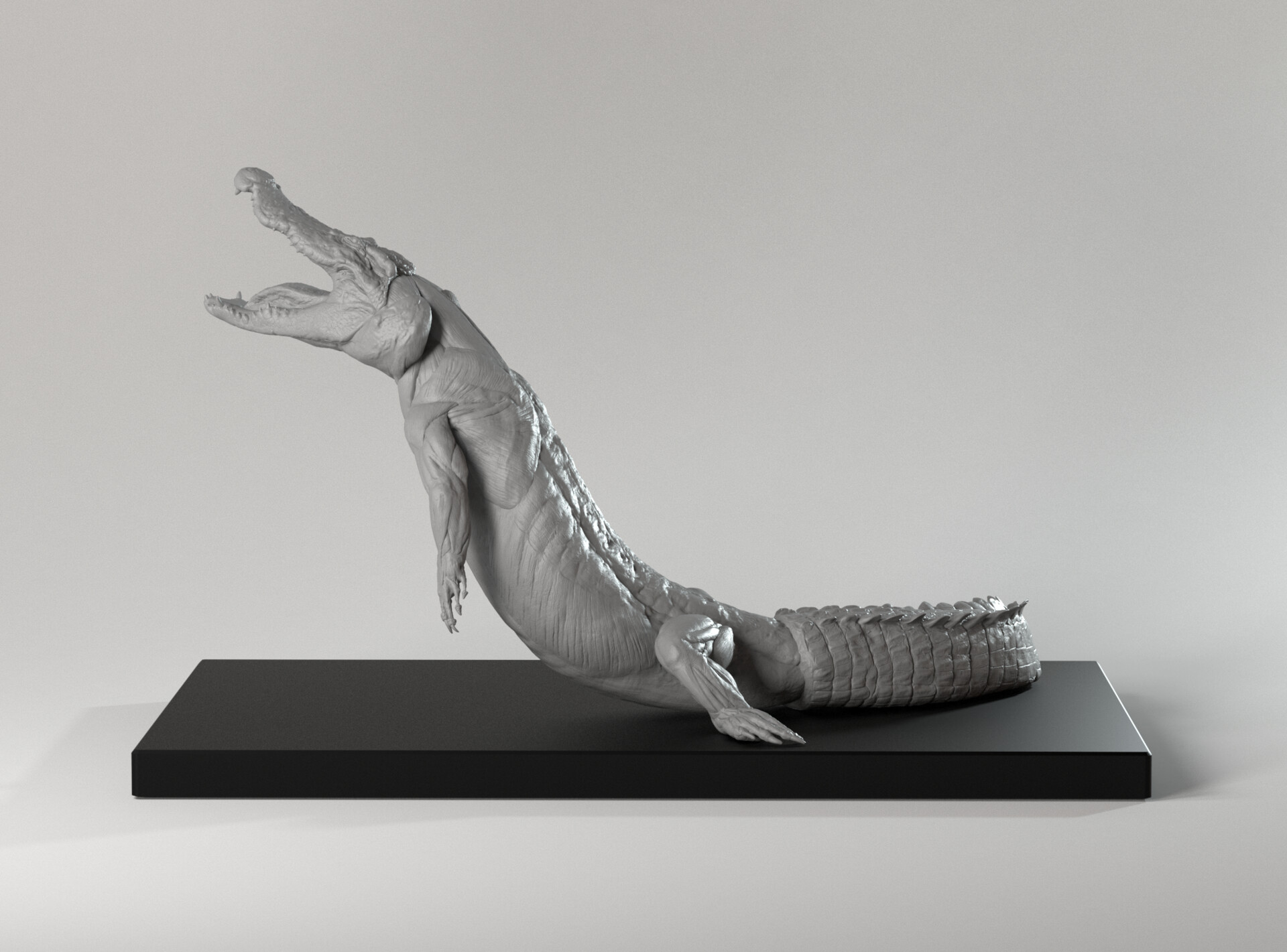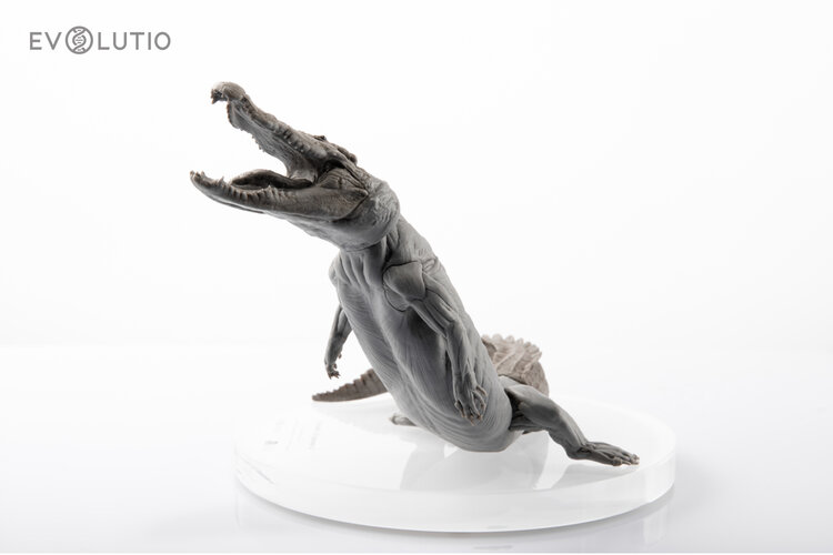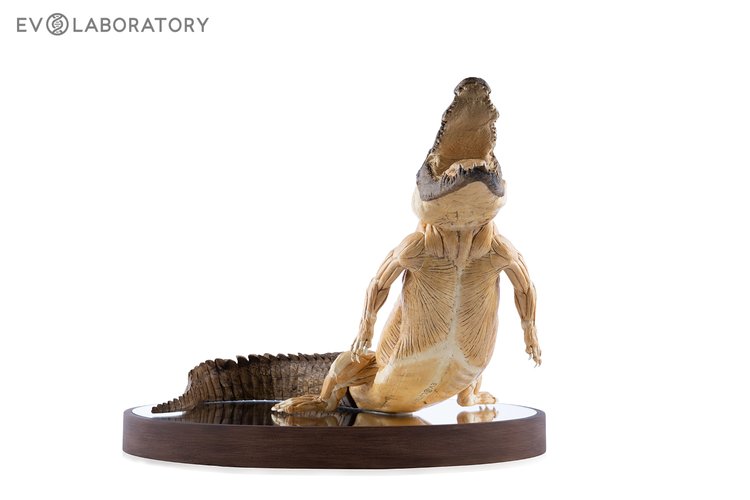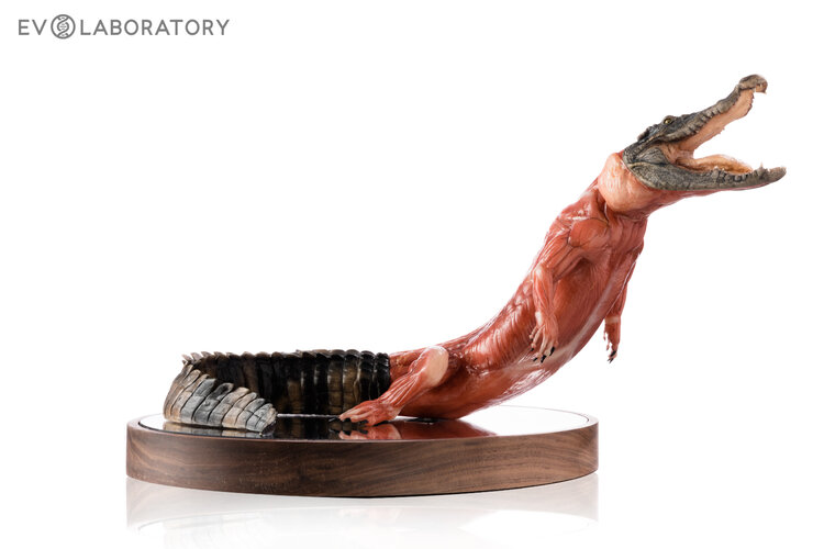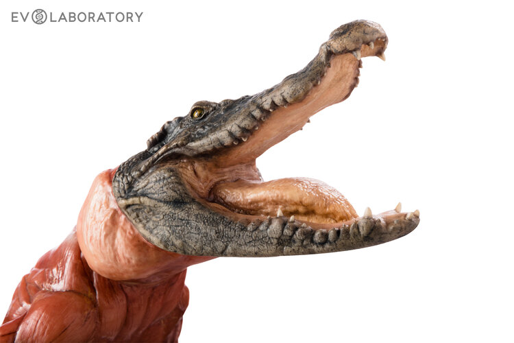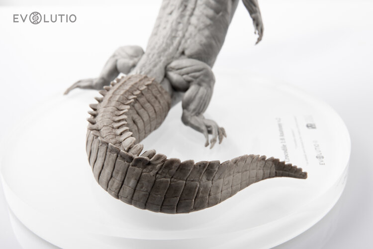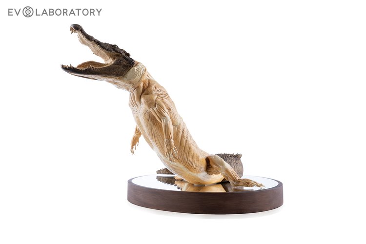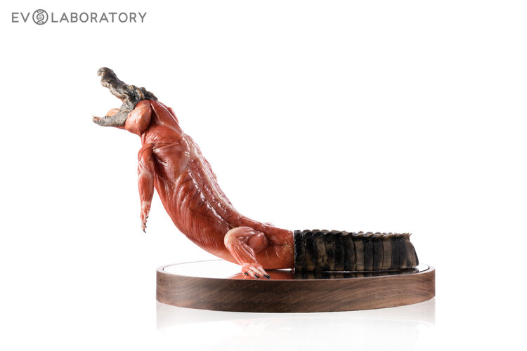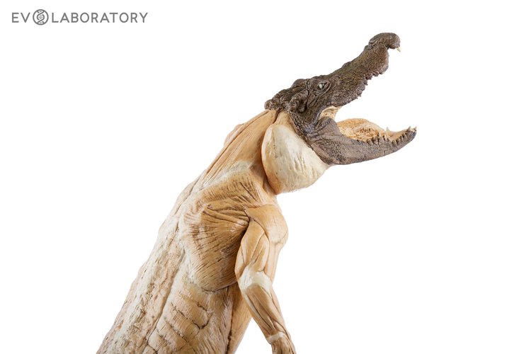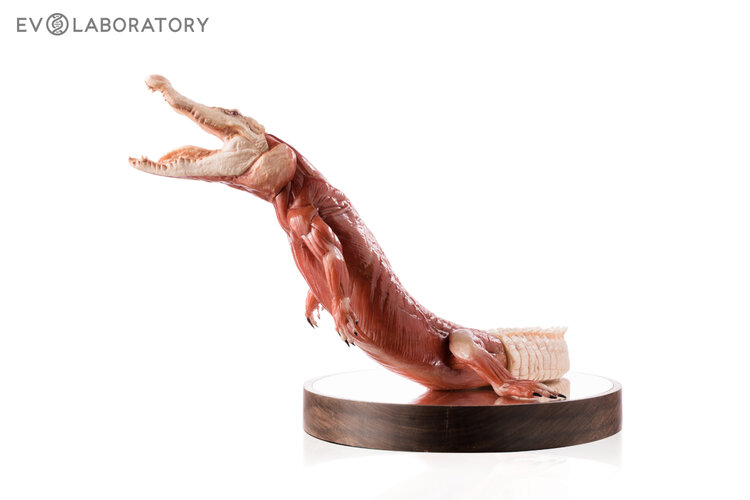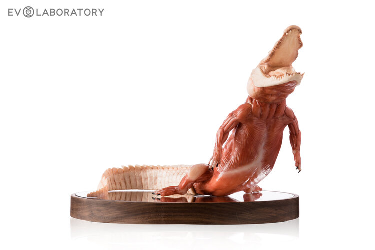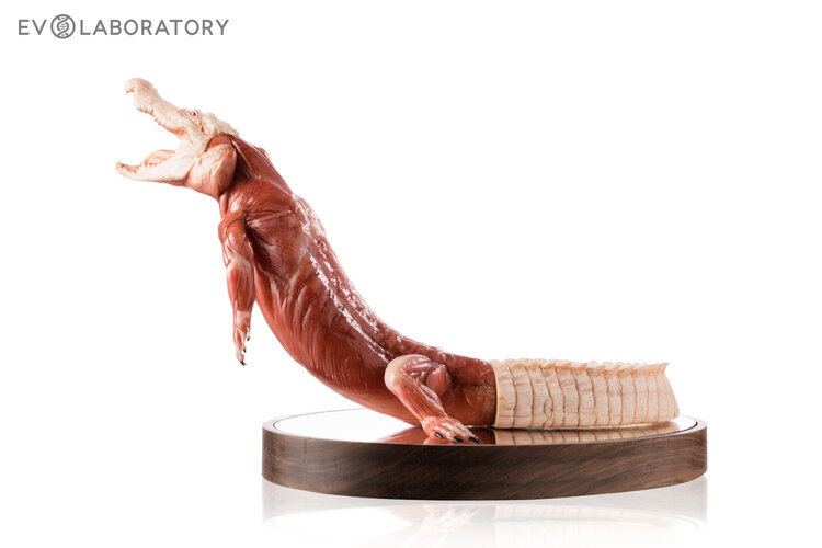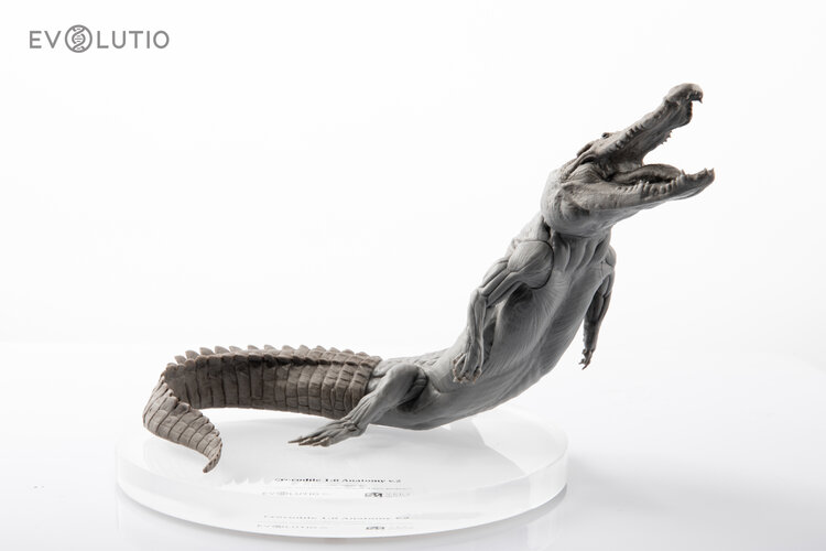 Recreated at 1:8 life-size, from an actual crocodile, this desktop sized model, shows different anatomy systems, proportions, superficial & deeper anatomy & influence of underlying muscle & bone. Cast in neutral grey it is ideal for display of form & ideally suited for artistic reference, educational & student purposes. Includes high quality base & stand.
