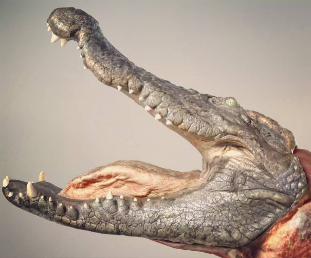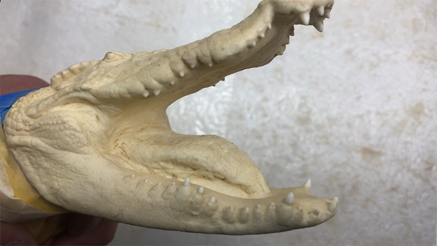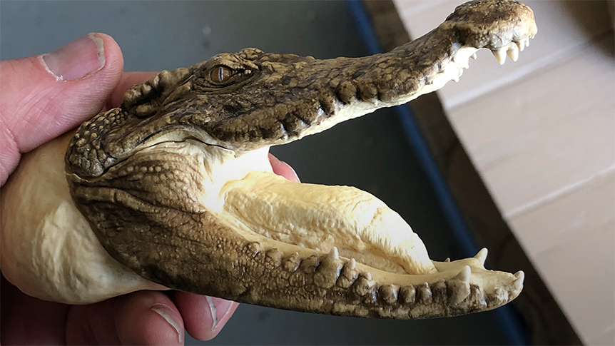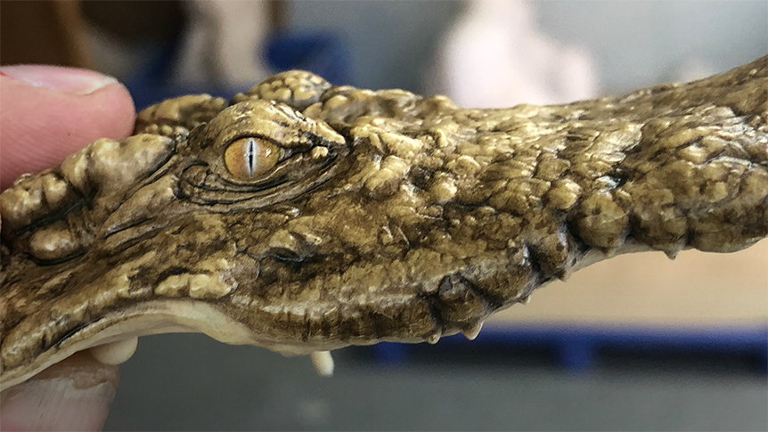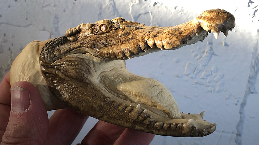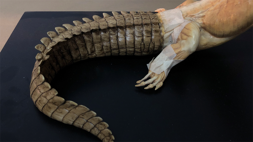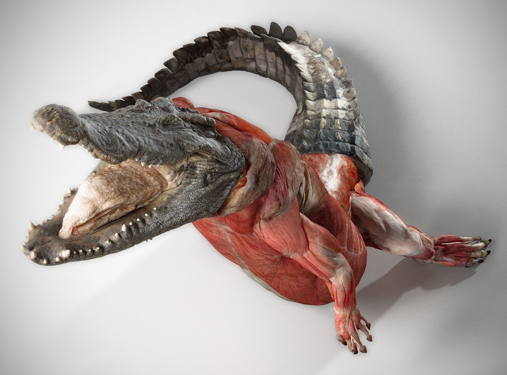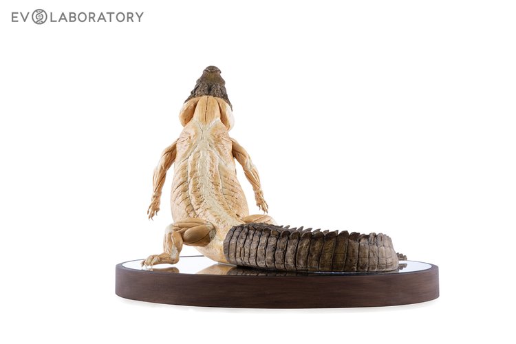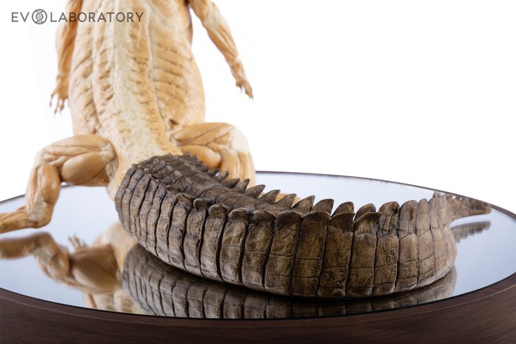 Recreated at 1:8 life-size, from an actual crocodile, this desktop sized model, shows different anatomy systems, proportions, superficial & deeper anatomy & influence of underlying muscle & bone. Cast in neutral grey it is ideal for display of form & ideally suited for artistic reference, educational & student purposes. Includes high quality base & stand.