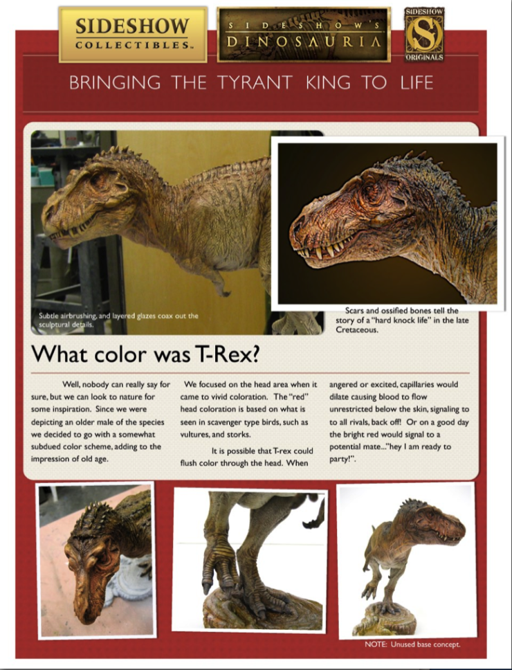 We all know that dinosaurs roamed the Earth thousands of years ago, but with limited fossils and constant new discoveries, scientists are still working to figure out just what these creatures really looked like. For the artists behind Sideshow’s Dinosauria, lots of research went into making the T-Rex a truly authentic representation of current science and scientific imagination. Luckily, Sideshow’s lead painter Anthony Mestas happens to be a BIG fan of dinosaurs and had a great time figuring out how best to capture the magic of the ‘Tyrant King’ in the Tyrannosaurus Rex Maquette