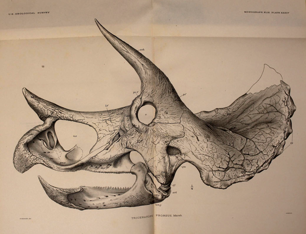 Drawing of a Triceratops prorsus skull collected by the pioneering American palaeontologist Othniel Charles Marsh. The first fossils of this famous horned dinosaur were found in the late 19th century in Colorado, and have since been collected from Wyoming, South Dakota, Alberta and Saskatchewan. Biodiversity Heritage Library (CC BY-SA 2.0)
