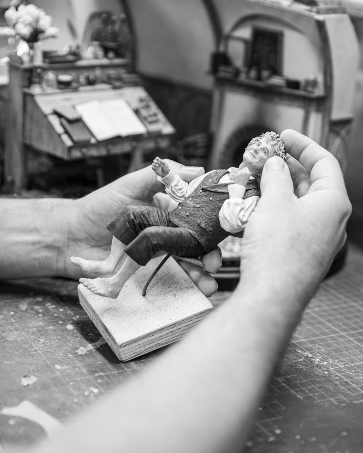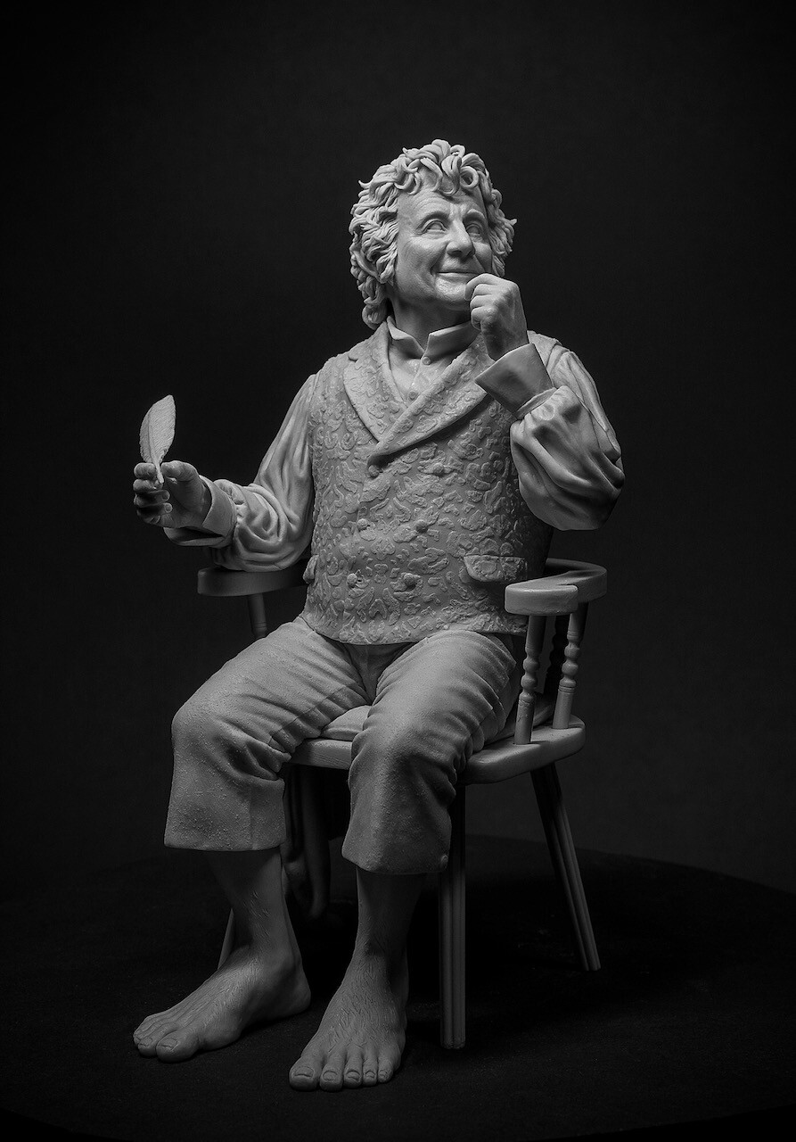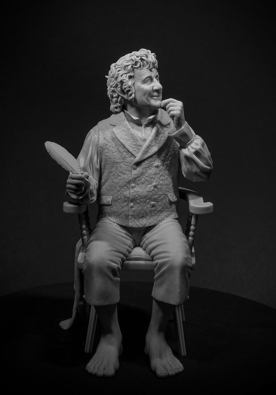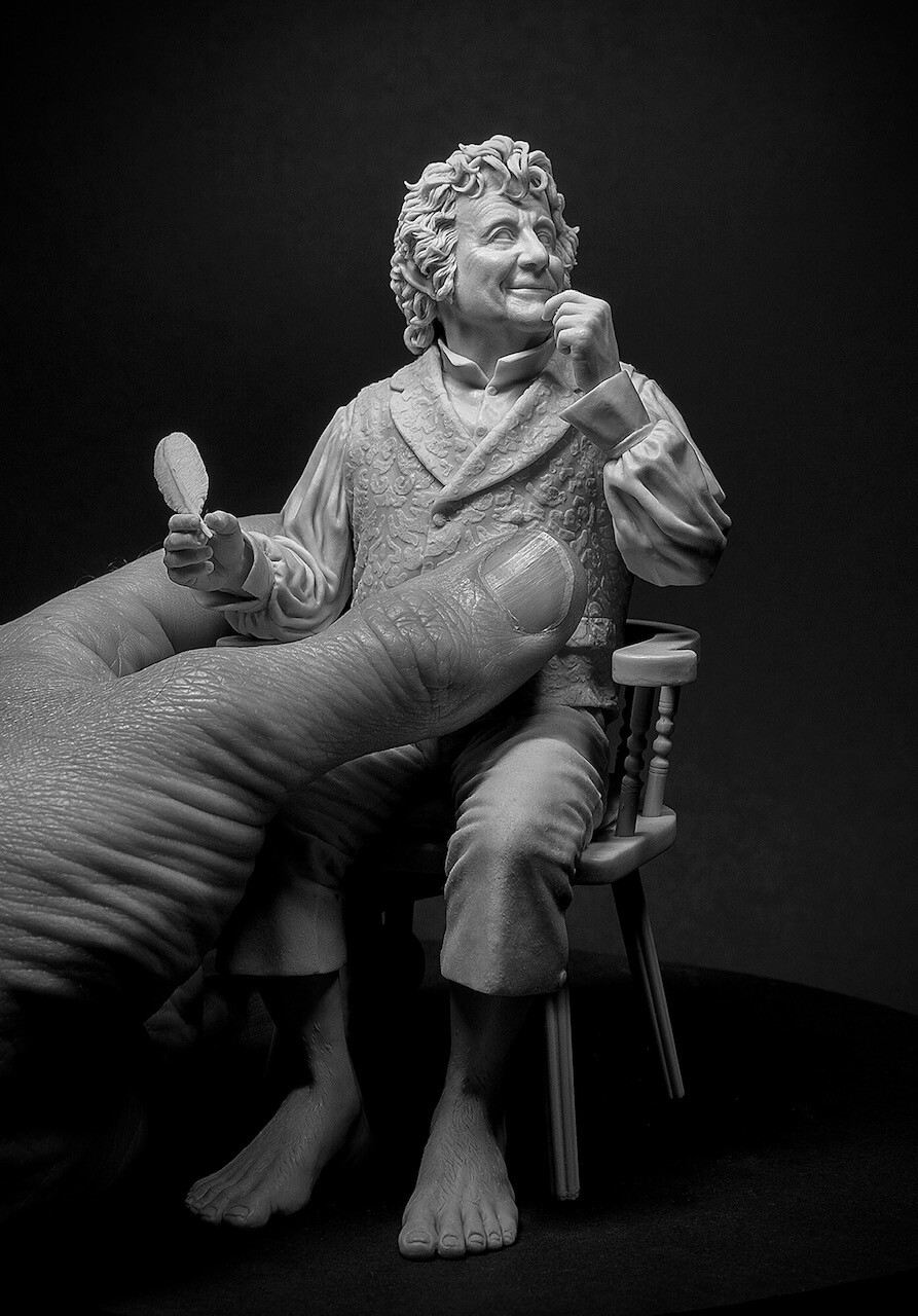 It’s Bilbo Baggins at Bag End, from Lord of The Rings. Whist working on this piece we heard of the sad passing of Sir Ian Holm, so the sculpture took on a poignant meaning. The collectible was officially released recently, so I thought I’d show some close ups of a resin cast so you can see some of the details. The chair was made by David Tremont.