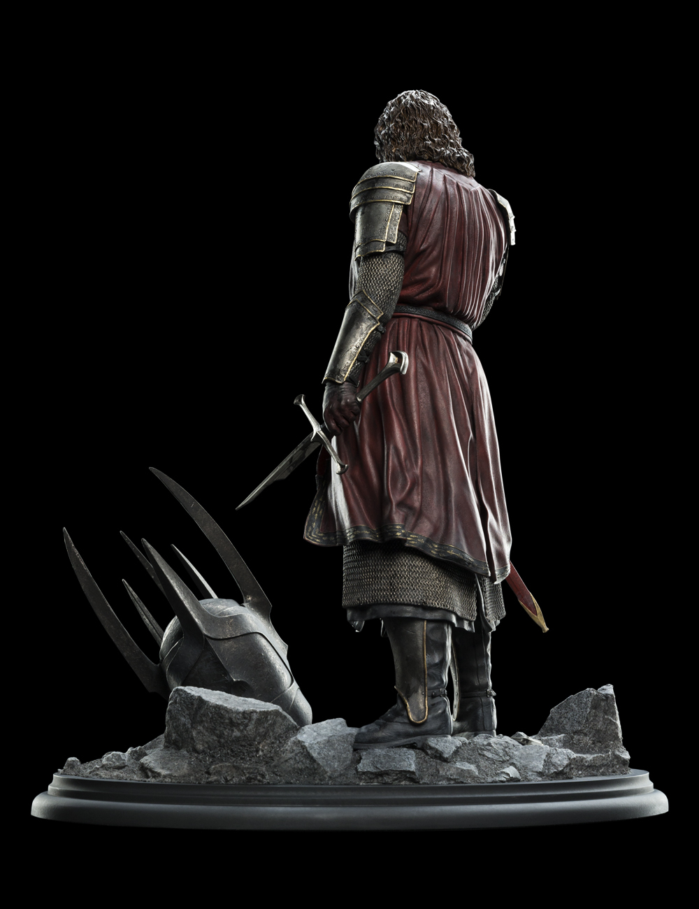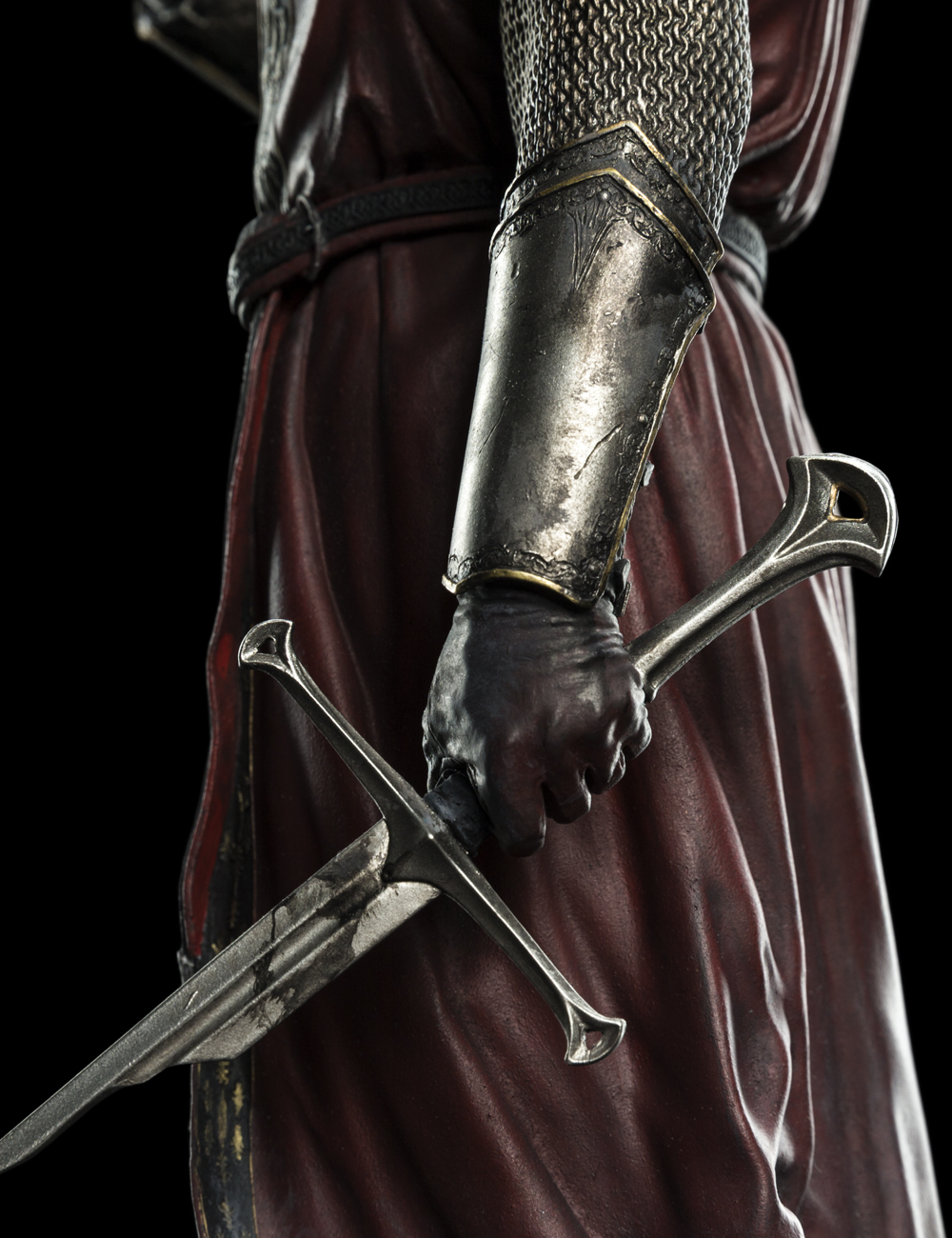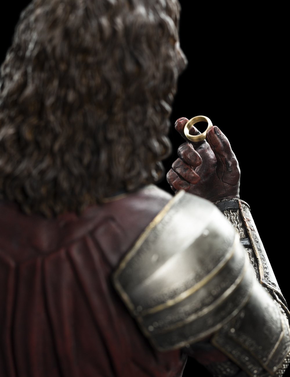 Distilling this complex scene into collectible form, was senior sculptor Daniel Cockersell – no stranger to Middle-earth, having formed part of Weta Workshop’s physical sculpting team on The Hobbit. Isildur stands complete in 1:6 scale: gazing at the One Ring, broken hilt of Narsil still clutched in one hand.