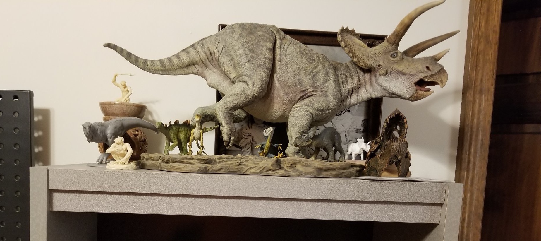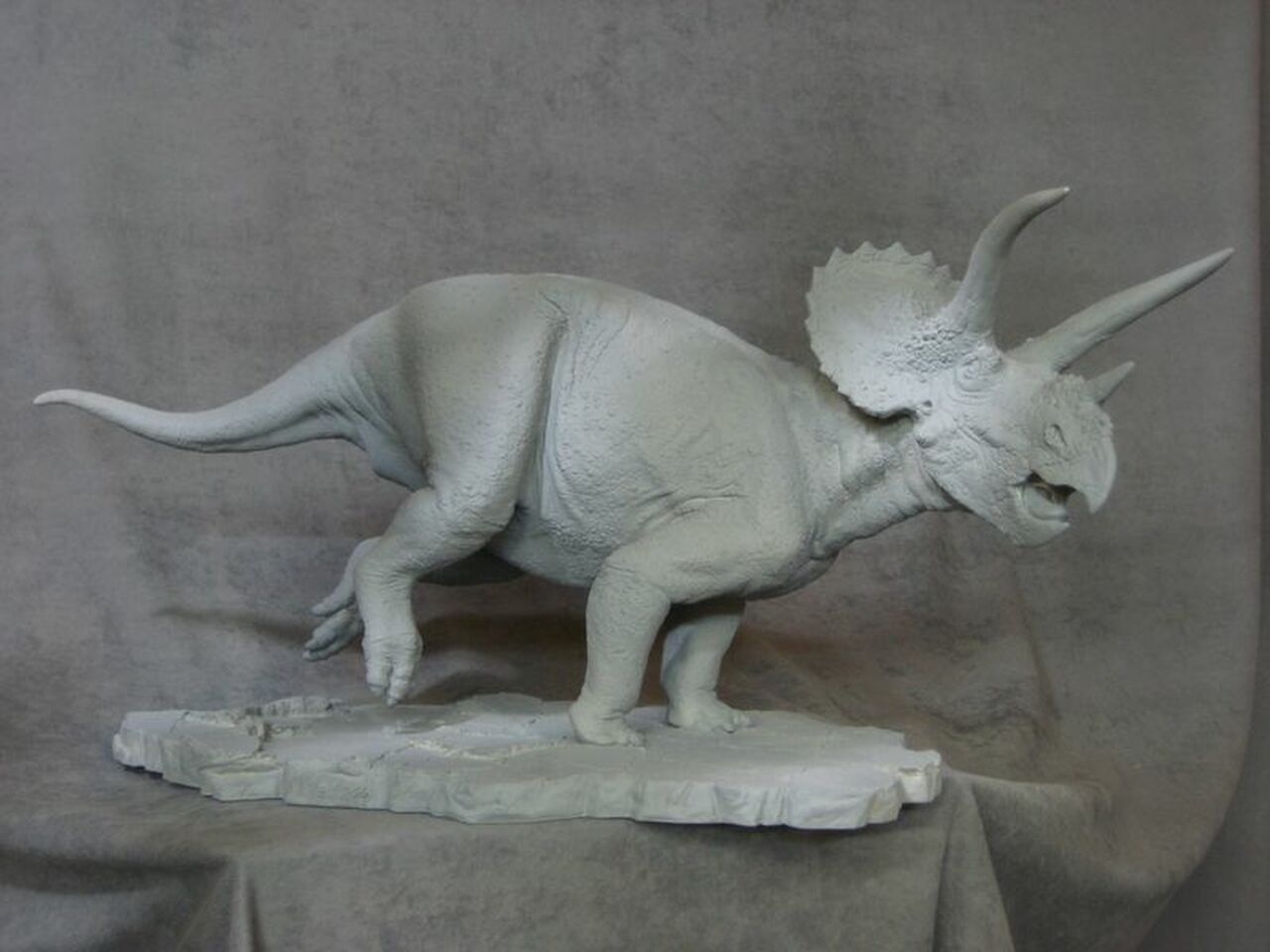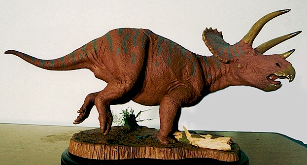 These two versions of Triceratops have maybe 10 years between them. the Galloping Triceratops was painted by Shane Foulkes, an amazing sculptor and painter who makes his own extensive line of dinosaur model kits, and I believe Shane assembled and painted this for a collector who initially purchased the kit from me. As usual, he did a beautiful job and also incorporated glass eyes. The second version is much more fanciful, since I decided to use an Indian rhino as a guide for the armor plating, a notion that seemed reasonable considering the kind of predators he shared his world with. Who knows, maybe I'll actually get around to painting him at some point.