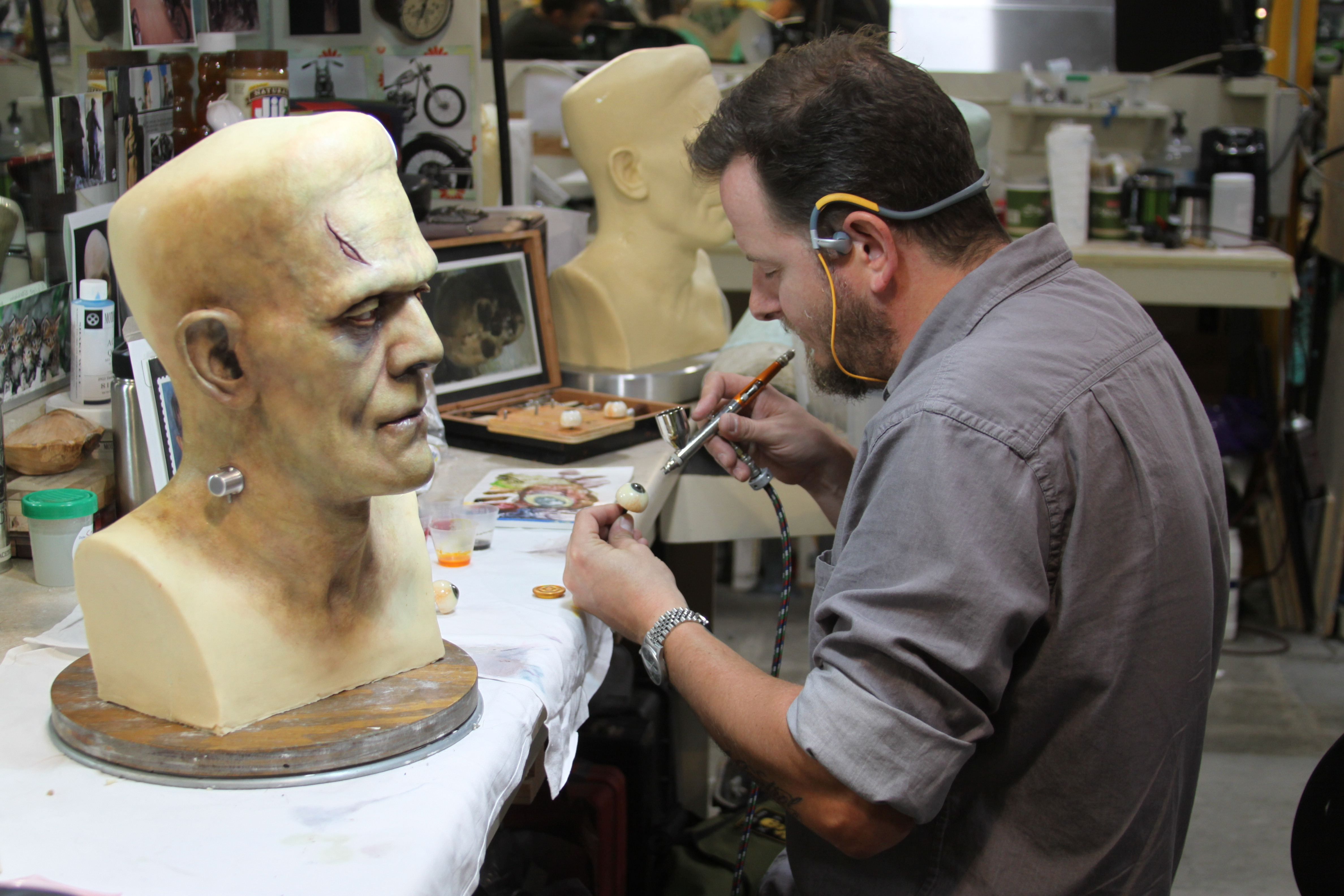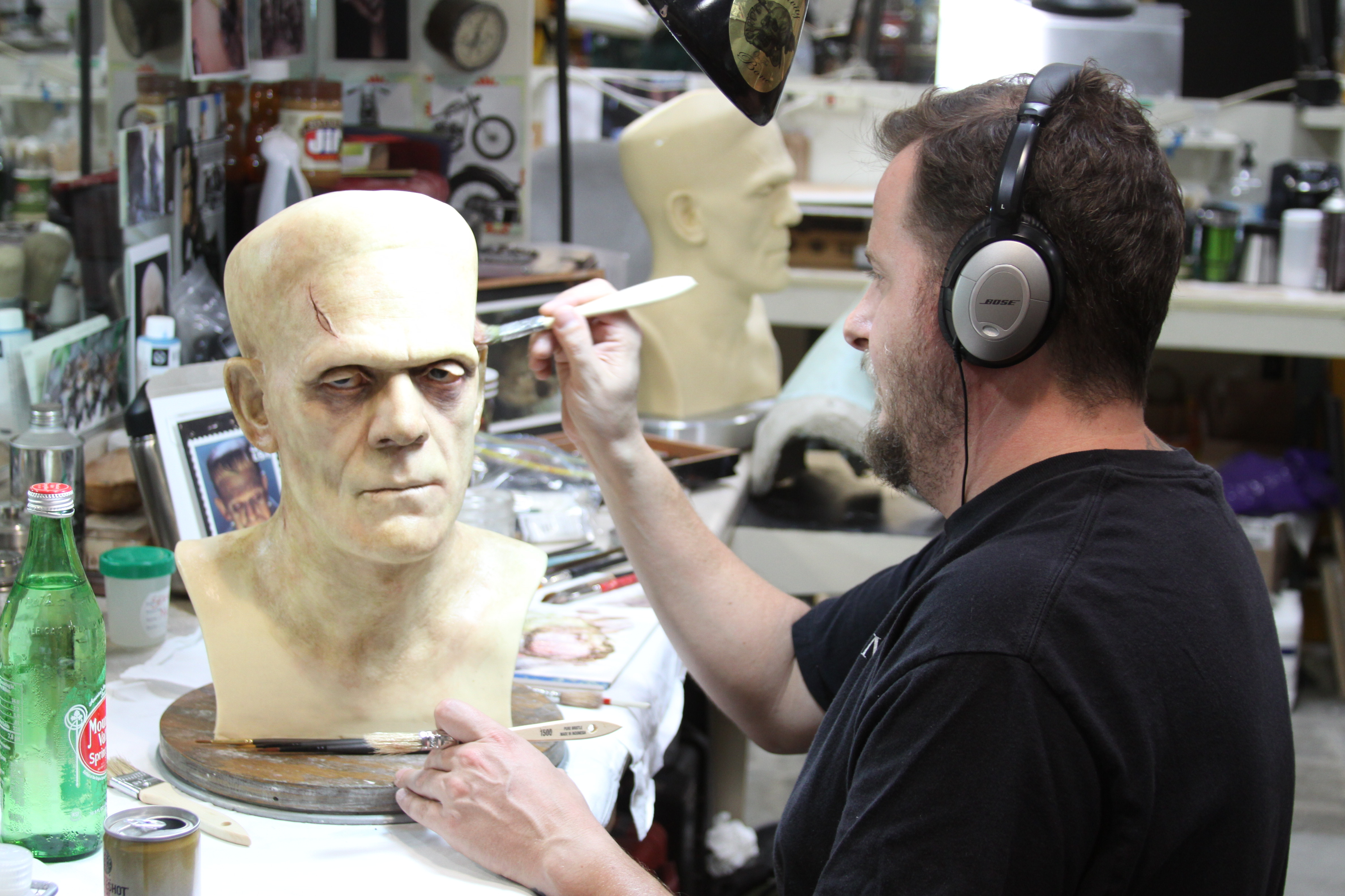 Bet you thought the above photo was a colorized image of Karloff the Uncanny himself. It’s actually a spitting image sculpture of the amazing Boris, but the finish is all from Legacy Effects. We put this together as a charity auction piece for the “It’s Alive” project, supporting St. Jude’s Children’s Hospital. One of the greatest movie monsters of all time, Frankenstein’s monster is a huge influence, and the reason many of us are in the business today. Naturally, we jumped at the chance to recreate this silver screen legend in an immortal medium, especially for such a great cause. The criteria for this project are to use an existing unfinished Frankenstein’s monster bust, and from it create an art piece. Being the movie geeks we are, we want to stay true to the image of the monster as he would appear in real life. We tried to deliver the most accurate representation of Franky as we could, adding realistic skin, scaring and hair to make this beast come alive.