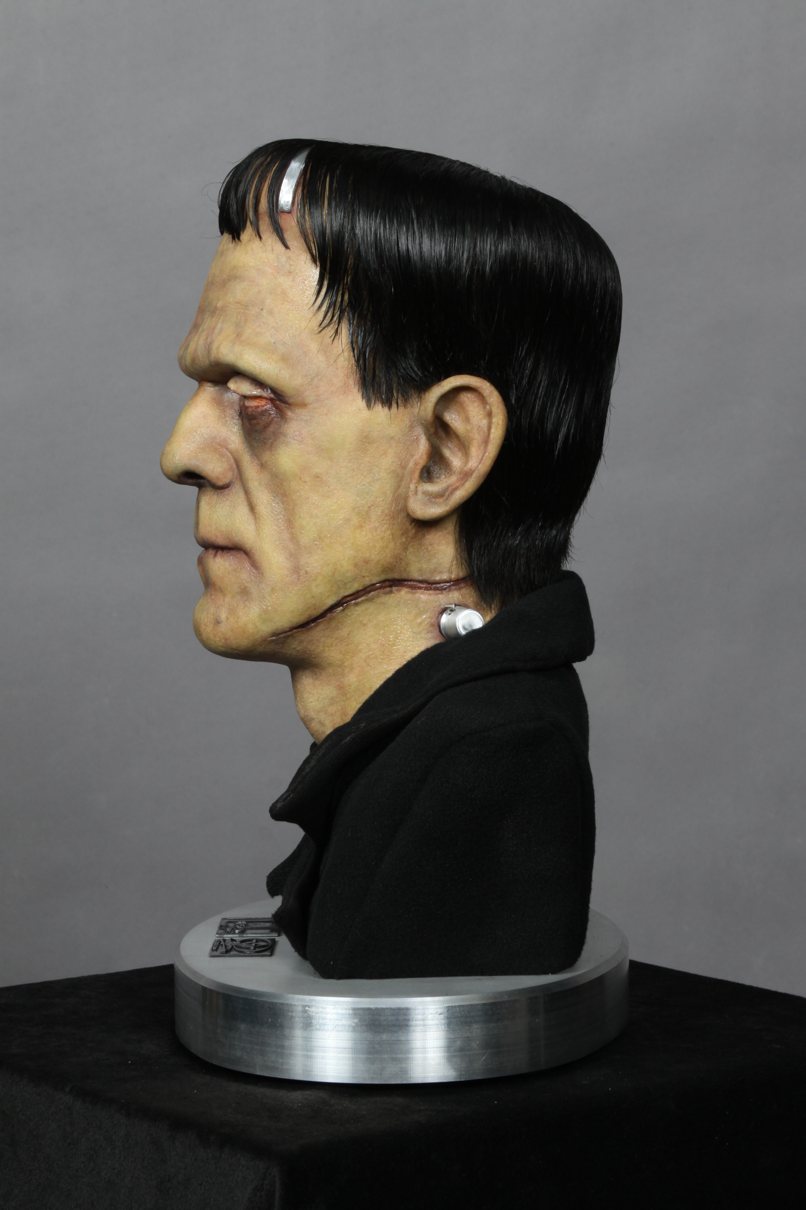 Hair has been painstakingly punched into a lace piece, applied to the crown and styled to creepy perfection. Prosthetic grade, bloodshot glass eyes are positioned in heavy-lidded sockets, individual eyelashes applied and actual tooled aluminum head-staple and famous neck bolts inserted.