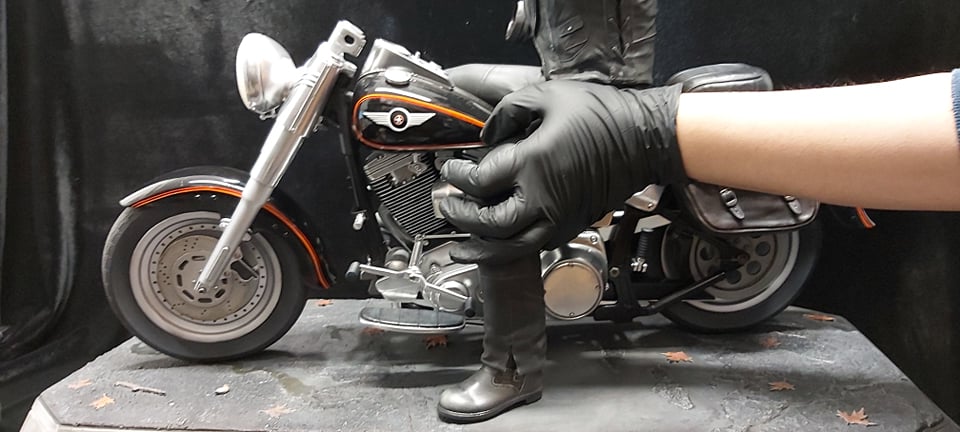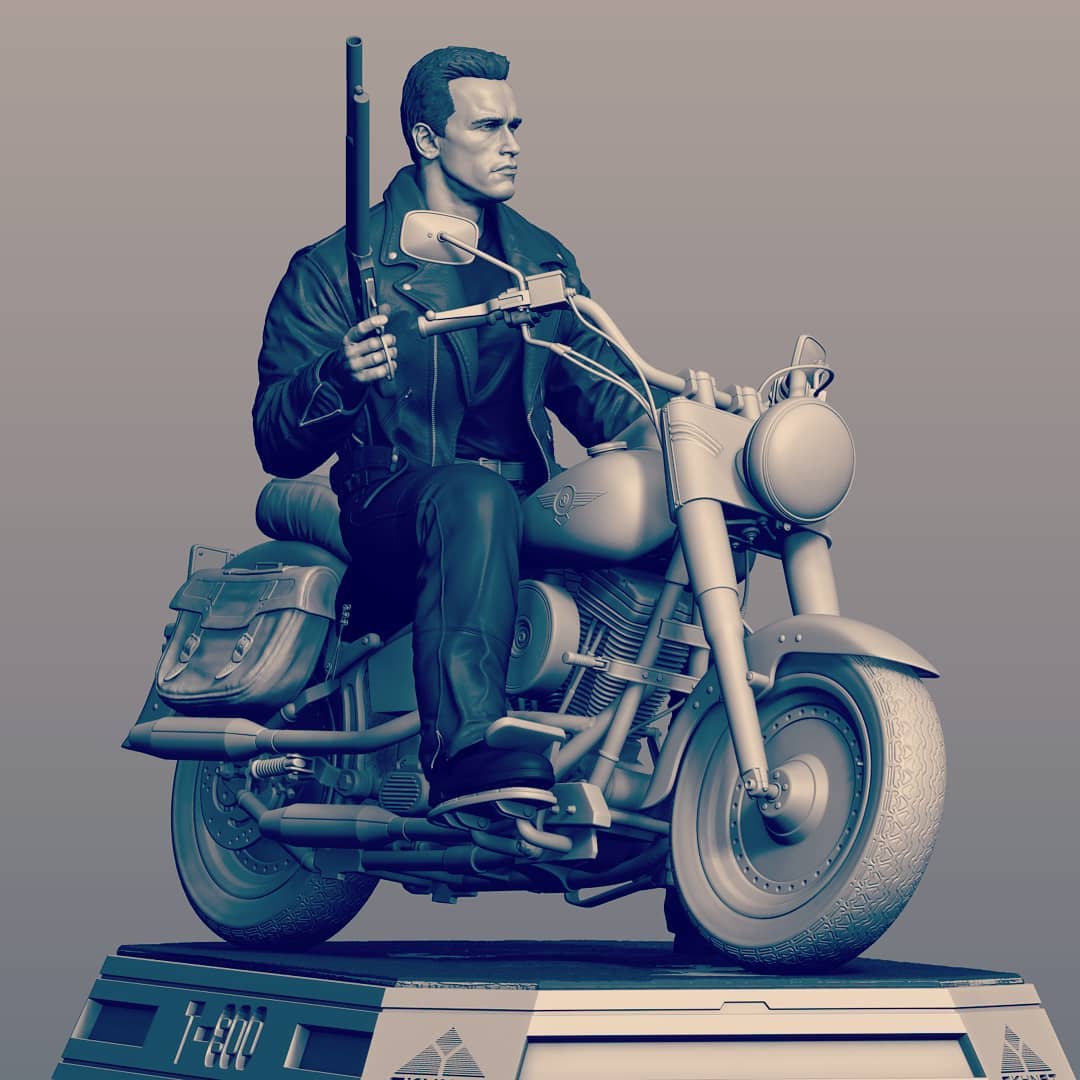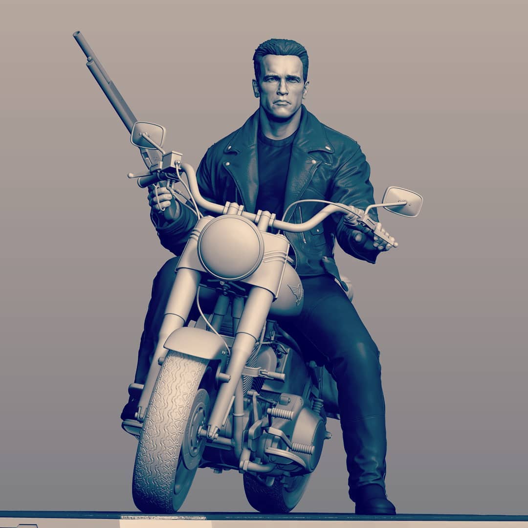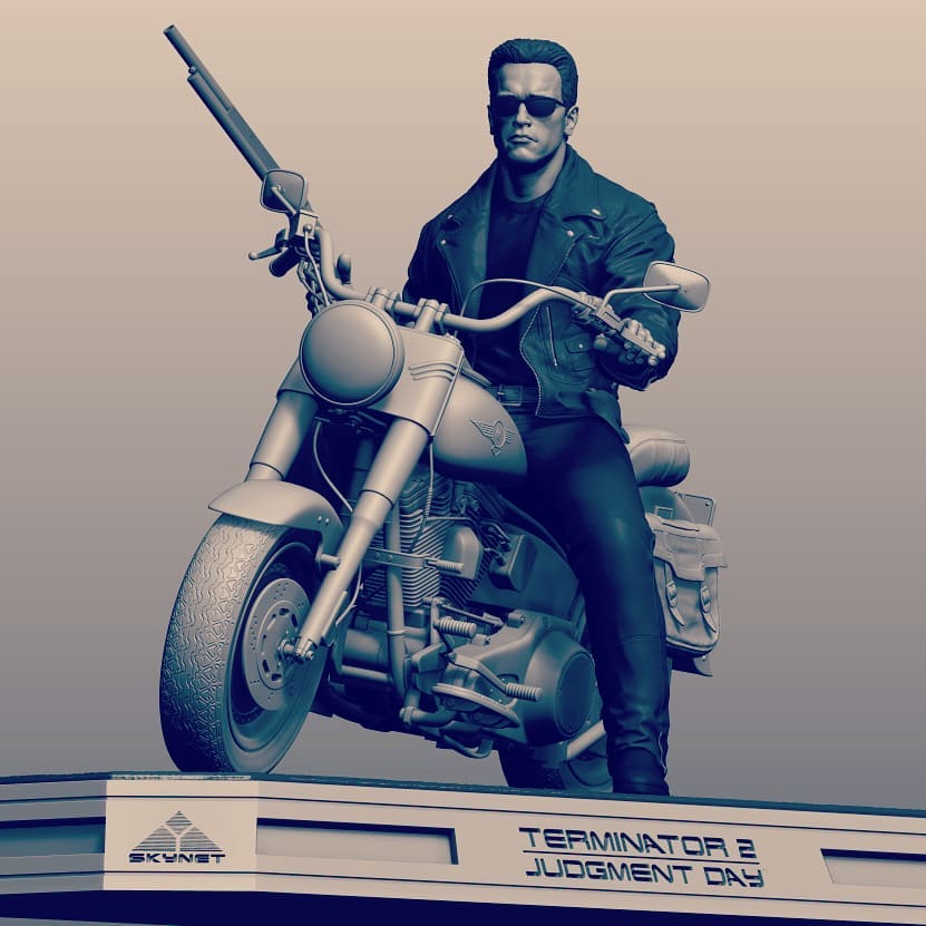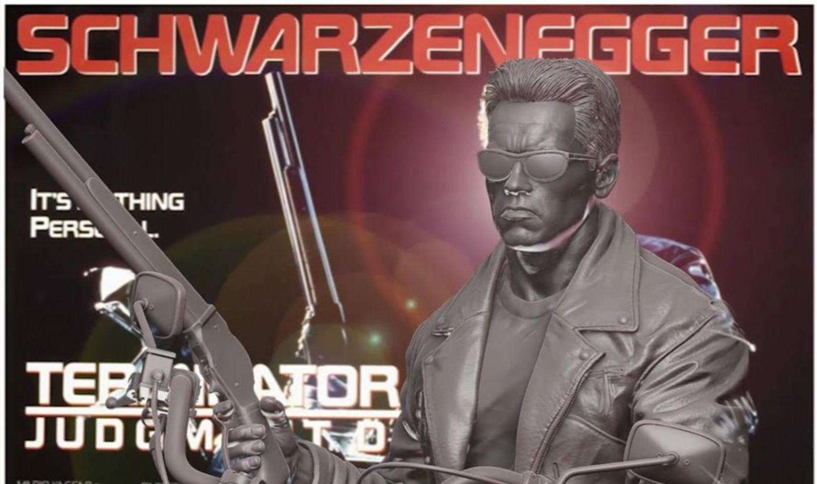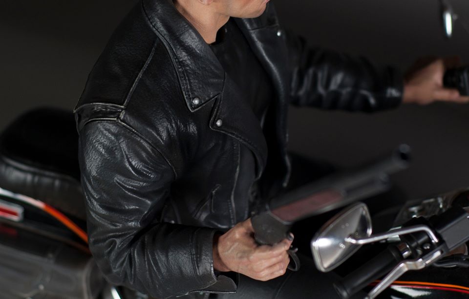 Featuring the likeness of the actor Arnold Schwarzenegger the statue captures the exact bad to the bone scene where the Terminator exits the bar, grabs the shotgun and sunglasses and rides the motorcycle.