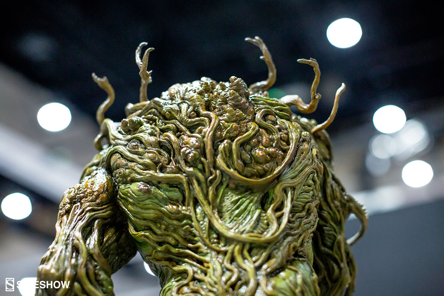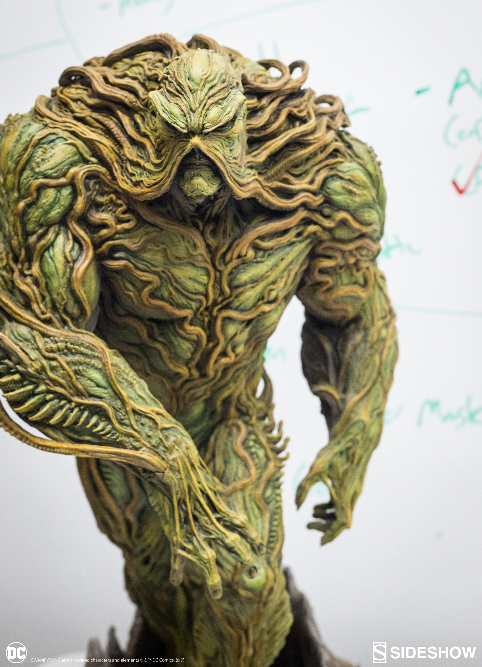 Swamp Thing has an intricate tangle of vines, roots, and tendrils emerging from his body, capturing the movement of his ever-changing natural form that balances humanoid musculature with living, growing vegetation. His sturdy body is made with vinyl, with PVC for his smaller parts to capture and preserve the immense detail in each layer of his form.
