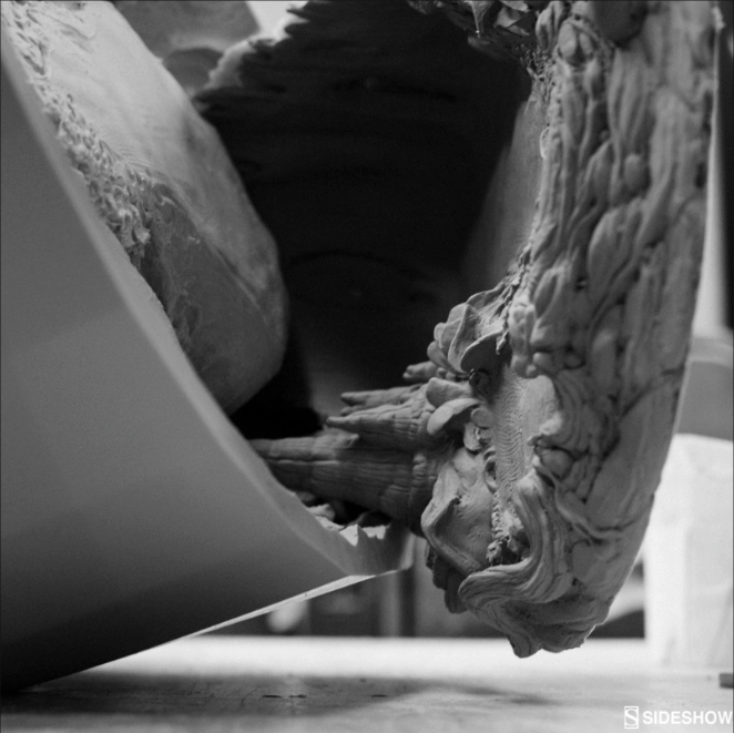 Early in the process, Paul sculpted a mini-maquette out of Super Sculpey in order to have a 3D visual reference for himself. He brought the miniature to Sideshow Live– its base even had the tiny turtle and snake as seen on the full maquette!
