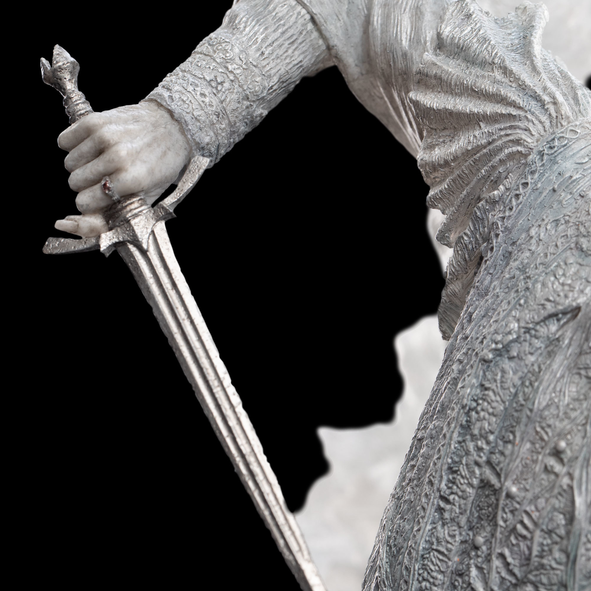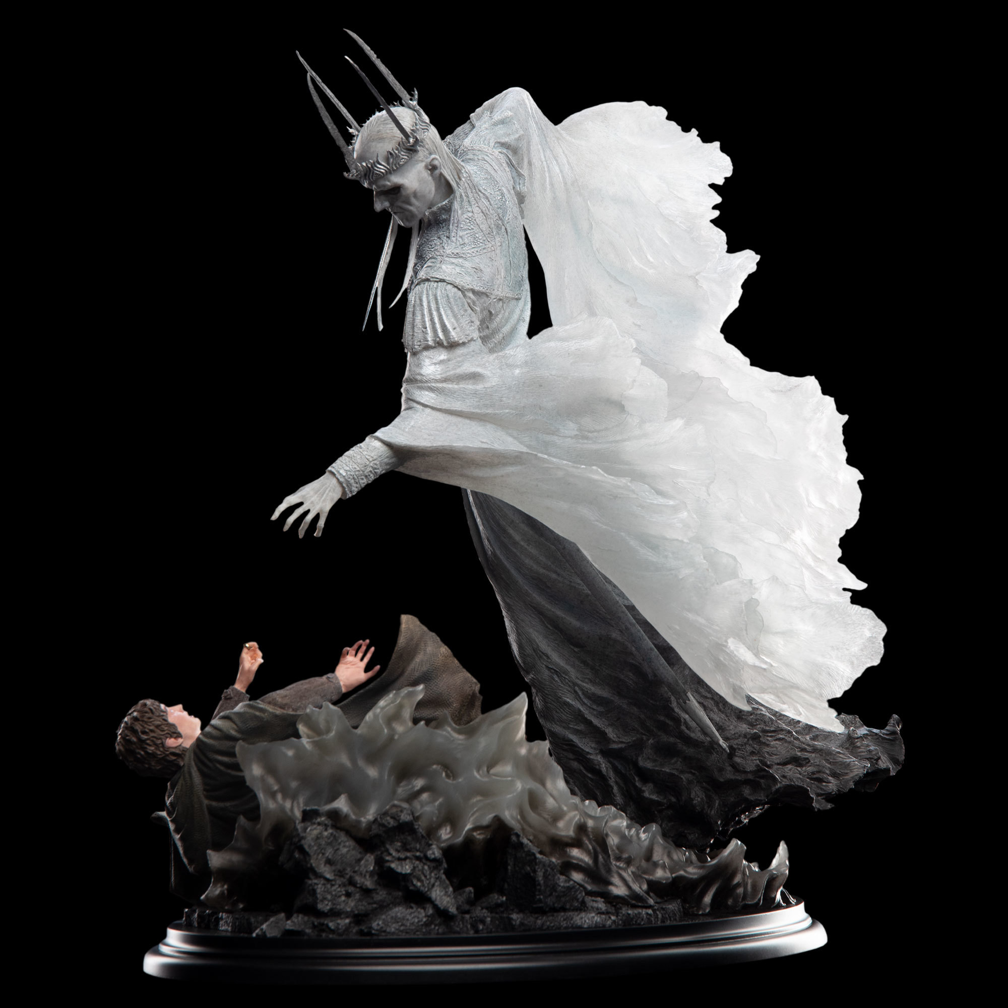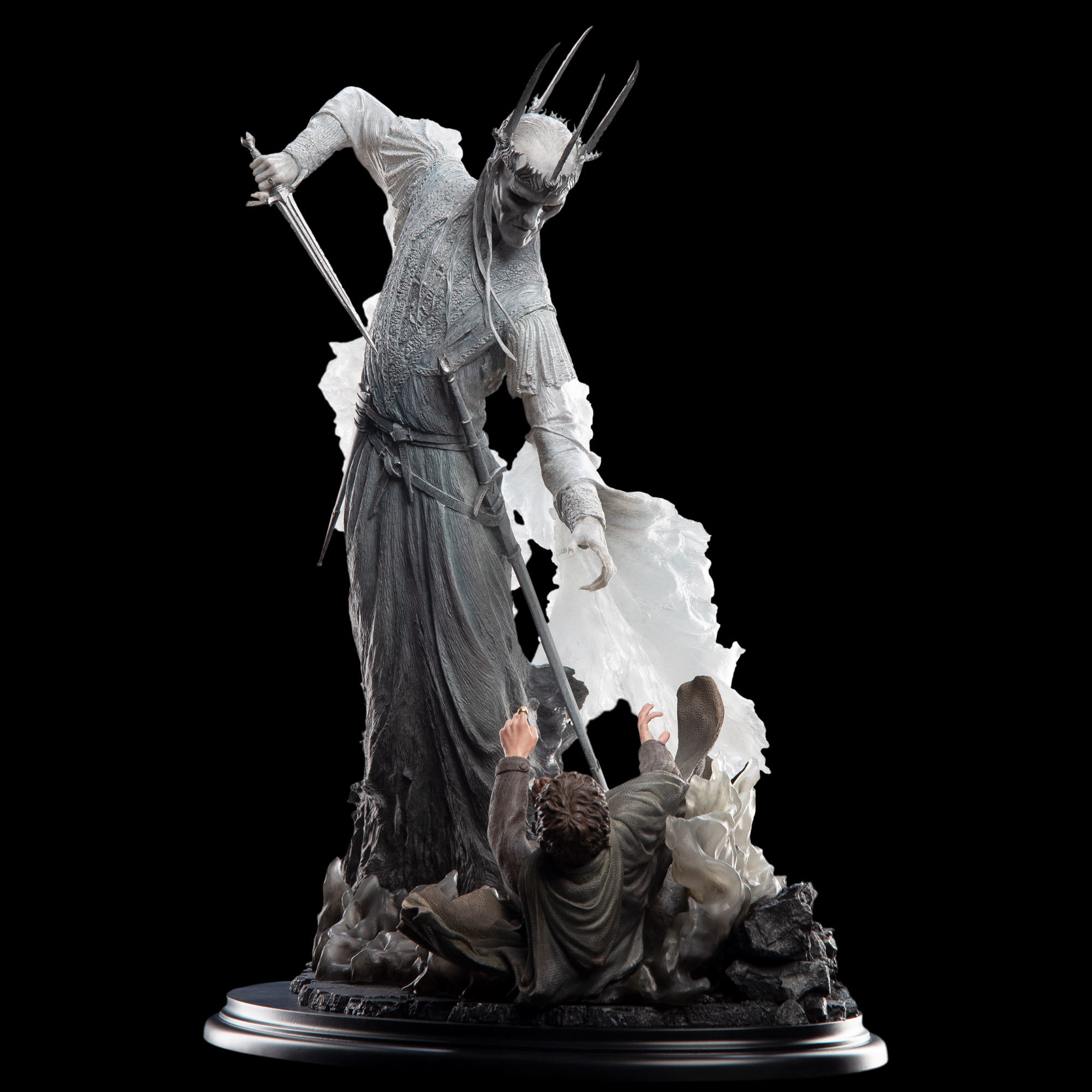 Unable to resist, Frodo thrusts the One Ring onto his finger and is plunged into the grey spirit world of Ring-sight. No longer an empty black robe, the Witch-king is revealed to Frodo in his true form, fell and terrible to behold. Beneath a bladed crown he glows with an unearthly light; a tall white being of ghostly skin drawn about sunken features, wispy hair whipped by an ethereal tempest, and a long, jagged blade in his luminous hand as he reaches for the Ring.