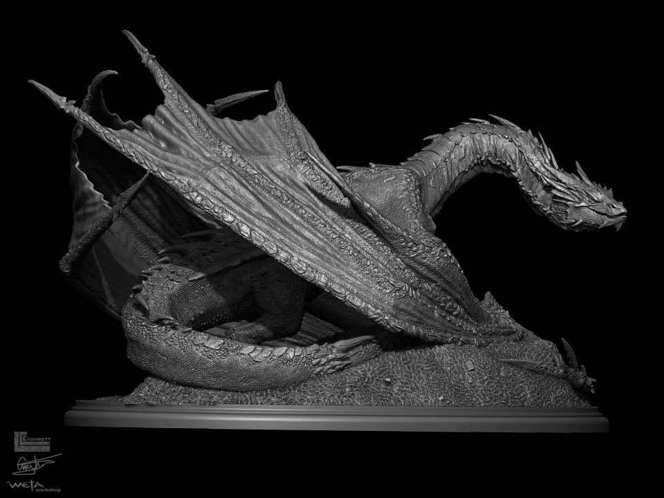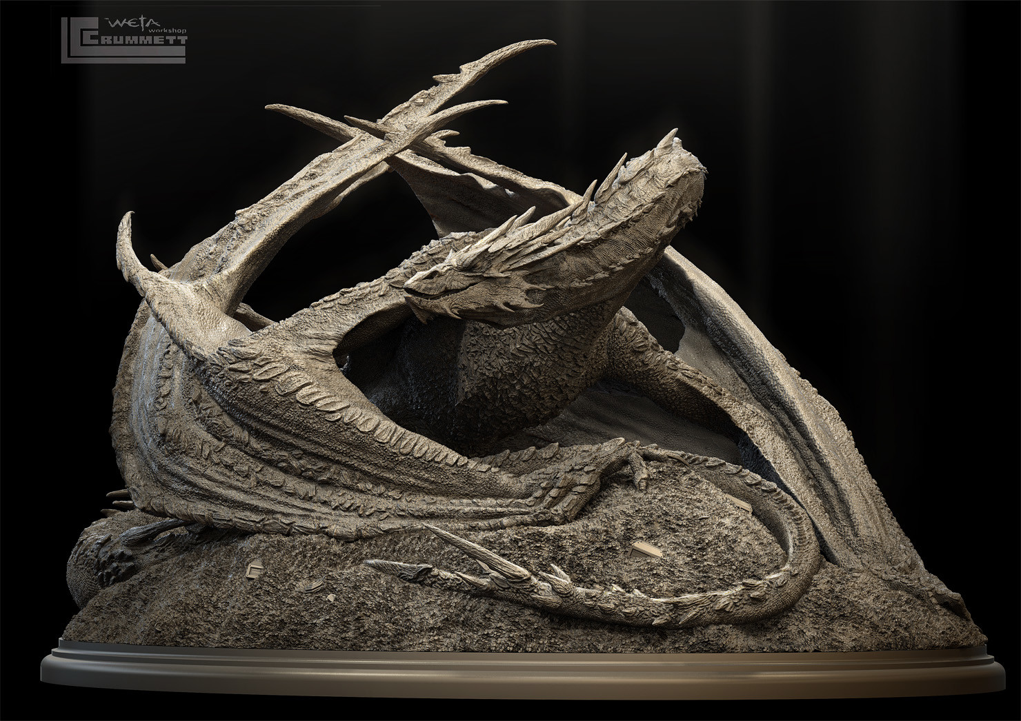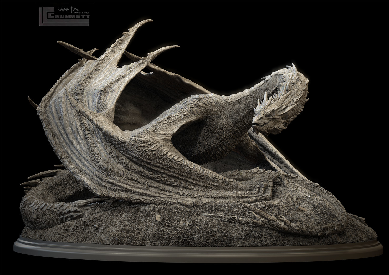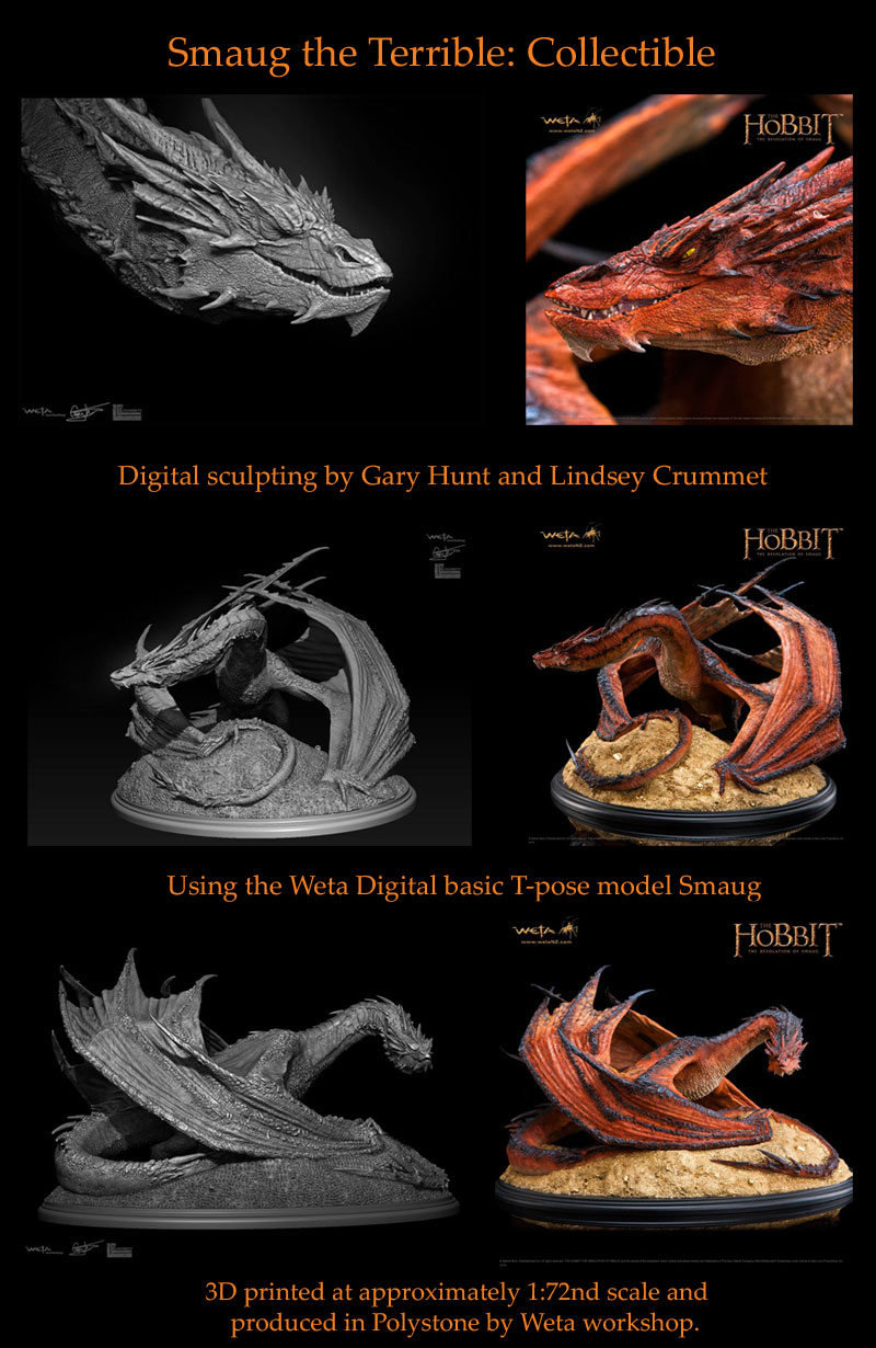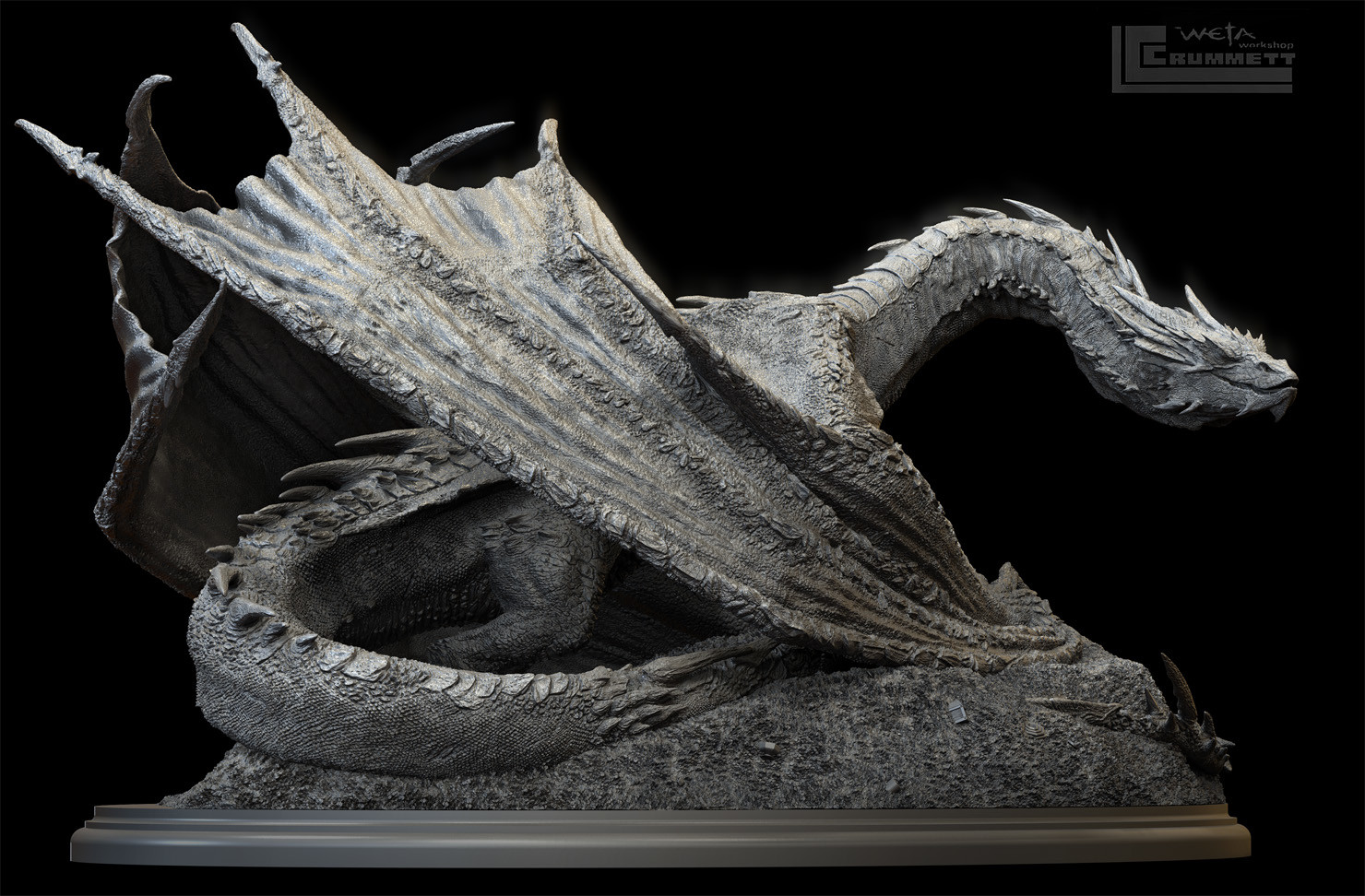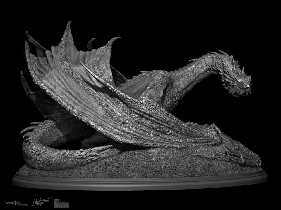 We have just opened the finished painted Smaug the Terrible collectible for pre orders and we would like to share some images of what a piece like this looks like when the sculptors Lindsey Crummett and Gary Hunt hands it over to the manufacturing team for printing, clean-up, molding, painting and manufacturing. Lindsey and I used the Weta Digital basic T-pose model as a base, added texture and extra details to it, thickened areas such as spines and wing membranes to make it solid enough for a collectible. This detailed T-pose model was then posed, muscles, tension, movement and expression added before a final texture pass. We then sliced the mesh to create the kit parts for manufacturing... I then gets to 3D printed.... David Tremont and Leonard Ellis assembled the print which came in more parts than you can imagine and worked on extra gold, Dordi Bruland Moen did a wonderful paint job. Special thanks to Wil Furneax for helping me with my meshes through-out these collectibles, its been quite a learning curve! You can order Smaug and the other collectibles that I have worked on from Weta Workshop.