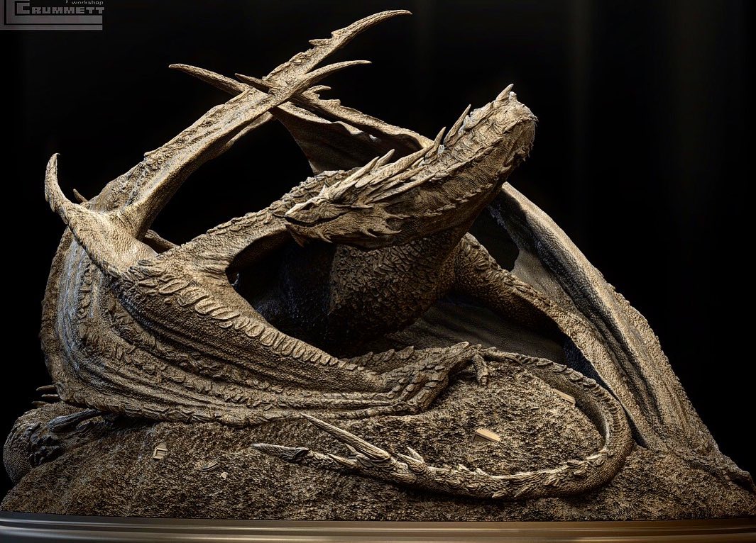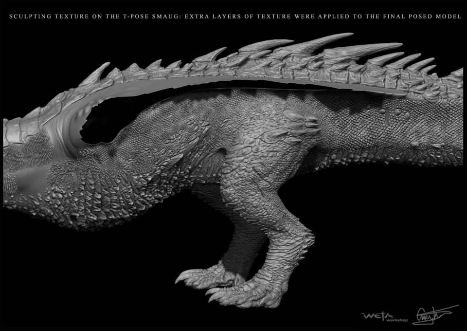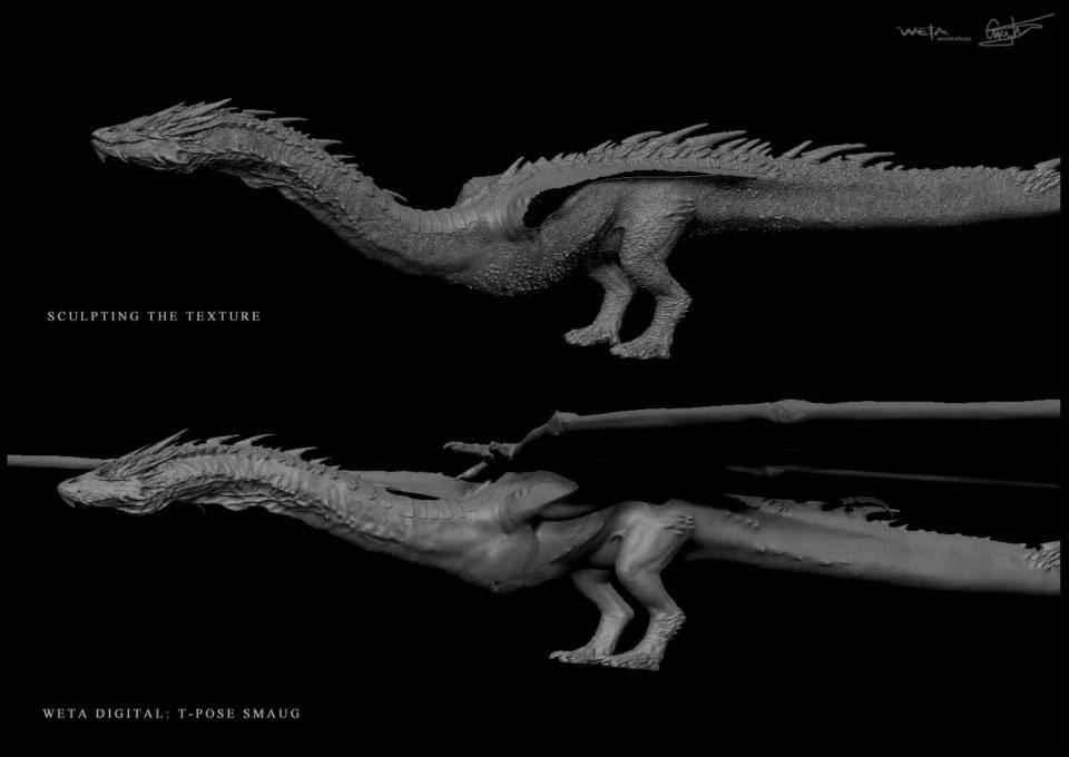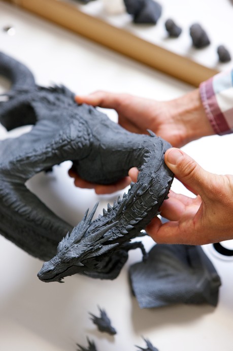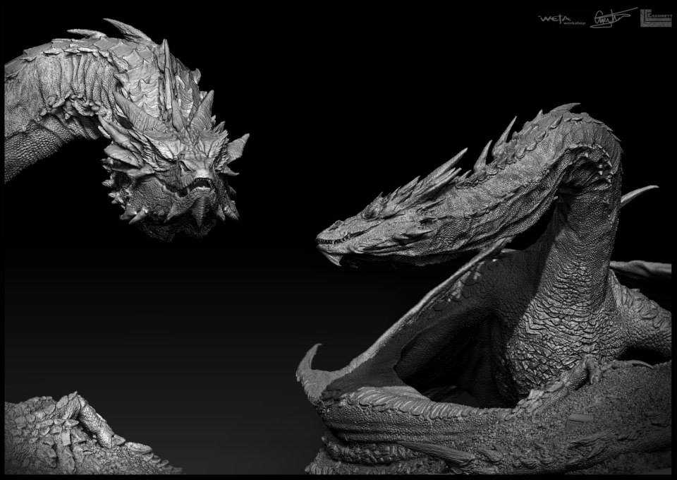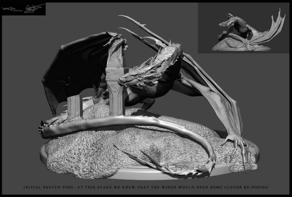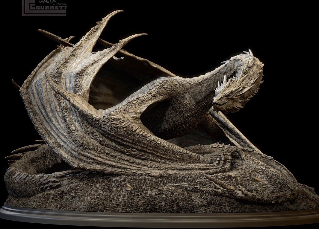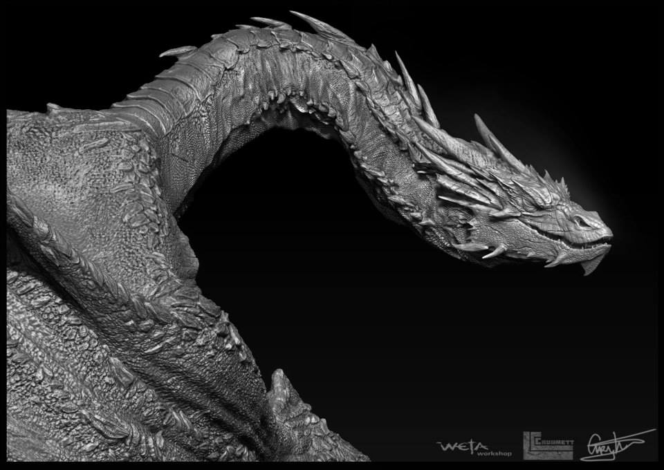 We have just opened the finished painted Smaug the Terrible collectible for pre orders and we would like to share some images of what a piece like this looks like when the sculptors Lindsey Crummett and Gary Hunt hands it over to the manufacturing team for printing, clean-up, molding, painting and manufacturing. Lindsey and I used the Weta Digital basic T-pose model as a base, added texture and extra details to it, thickened areas such as spines and wing membranes to make it solid enough for a collectible. This detailed T-pose model was then posed, muscles, tension, movement and expression added before a final texture pass. We then sliced the mesh to create the kit parts for manufacturing... I then gets to 3D printed.... David Tremont and Leonard Ellis assembled the print which came in more parts than you can imagine and worked on extra gold, Dordi Bruland Moen did a wonderful paint job. Special thanks to Wil Furneax for helping me with my meshes through-out these collectibles, its been quite a learning curve! You can order Smaug and the other collectibles that I have worked on from Weta Workshop.