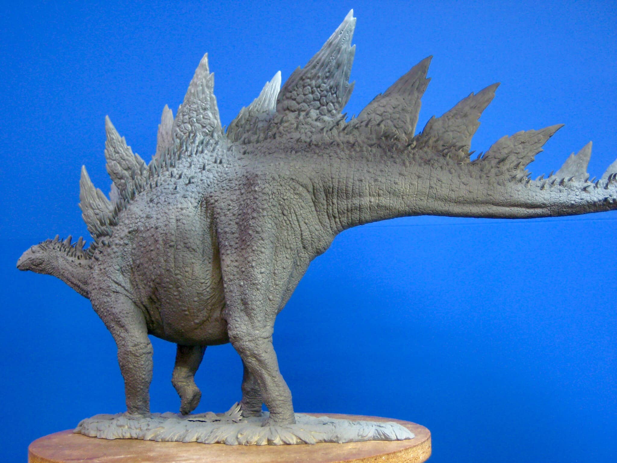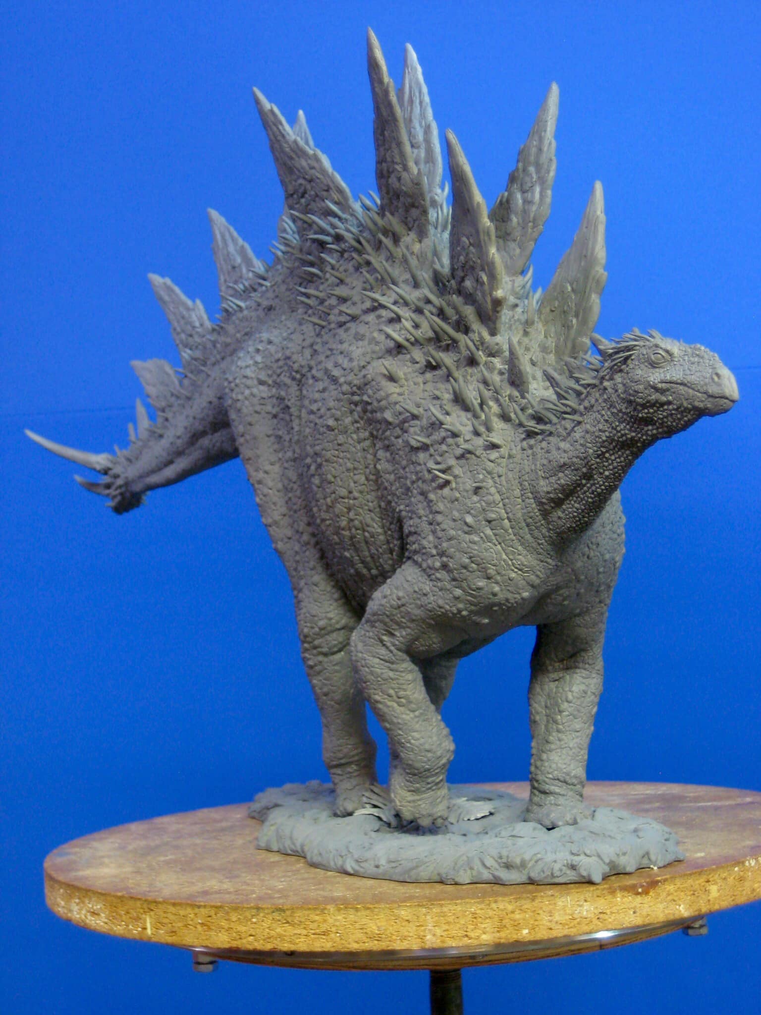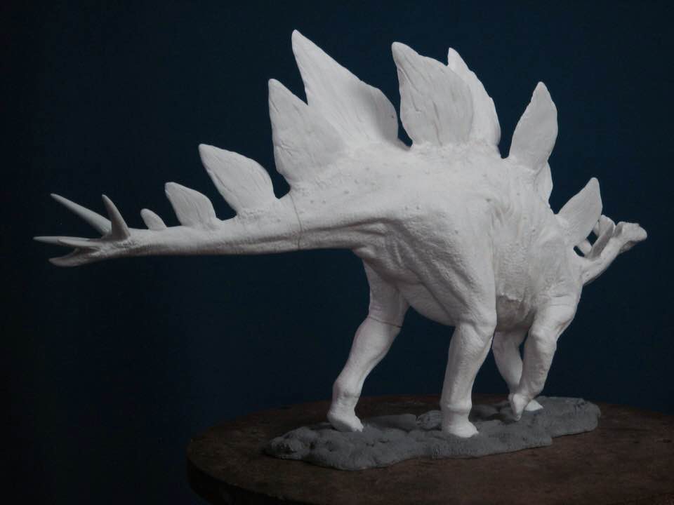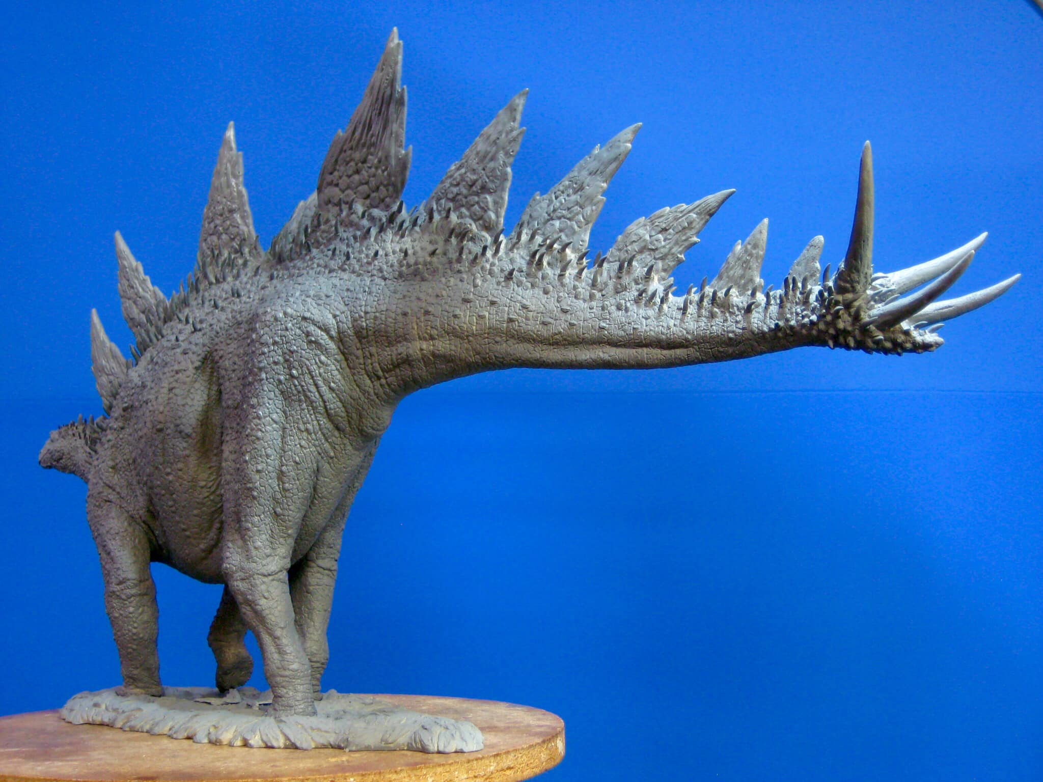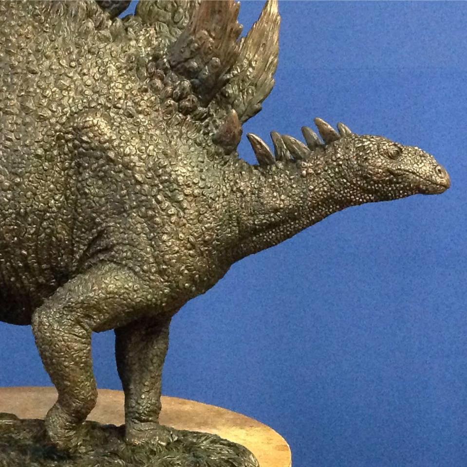 This 30" long Stegosaurus stenops was done around 2014 I think and I decided to just indulge myself and add various protective armaments that would seem appropriate on a large herbivore wandering through a world filled with packs of hungry carnivores. As far as I know, there's no fossil evidence for any of these dermal protections, except for the heavy scales on the throat.
