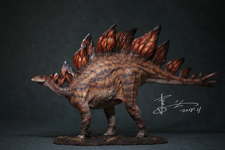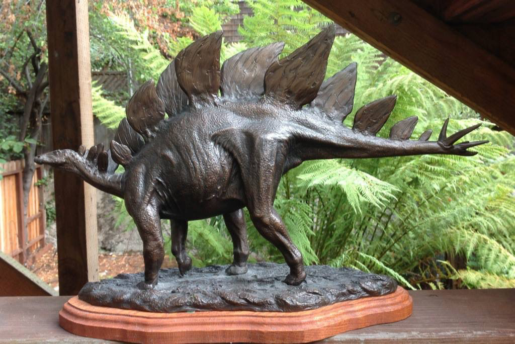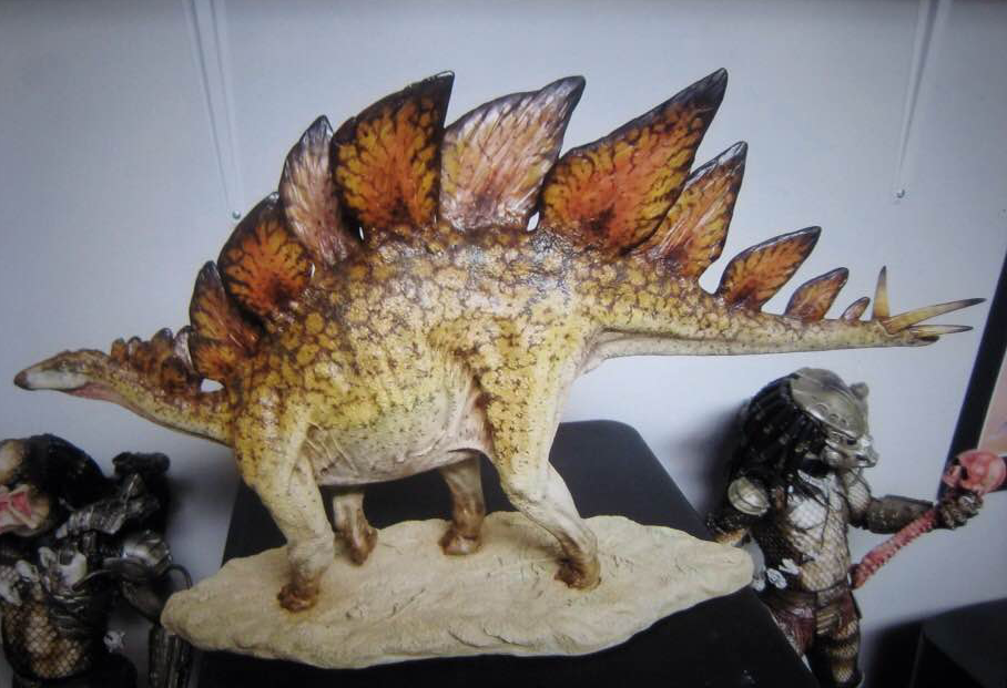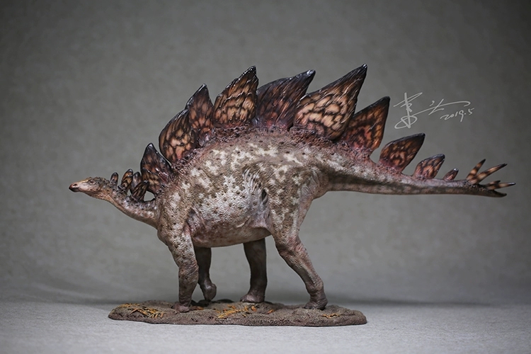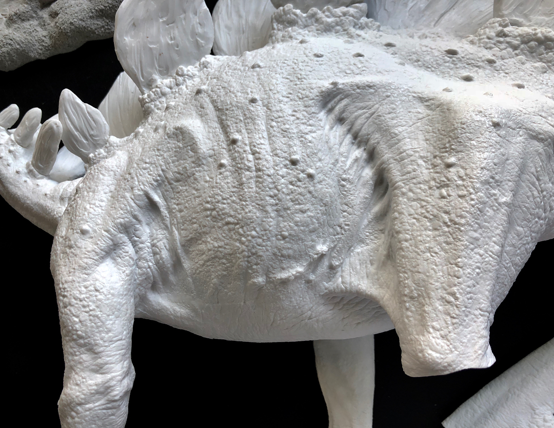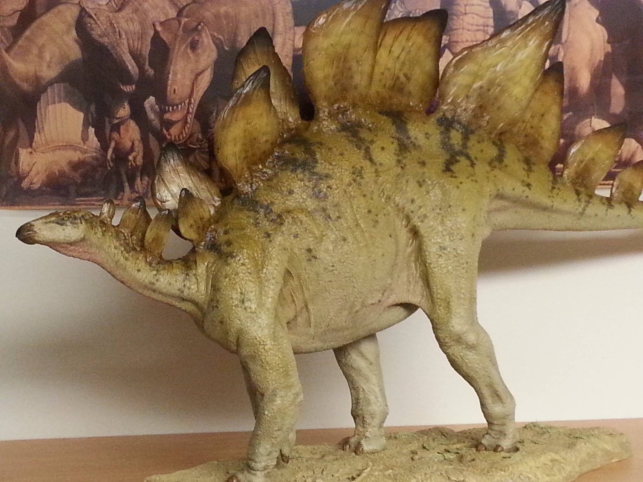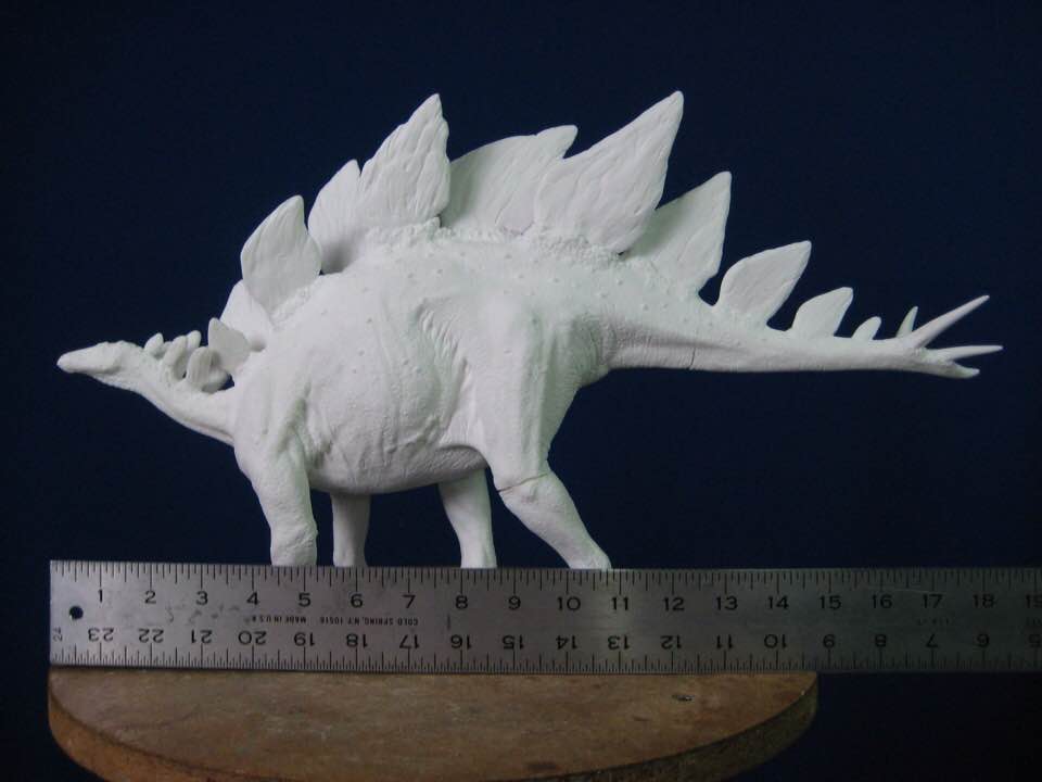 This 30" long Stegosaurus stenops was done around 2014 I think and I decided to just indulge myself and add various protective armaments that would seem appropriate on a large herbivore wandering through a world filled with packs of hungry carnivores. As far as I know, there's no fossil evidence for any of these dermal protections, except for the heavy scales on the throat.
