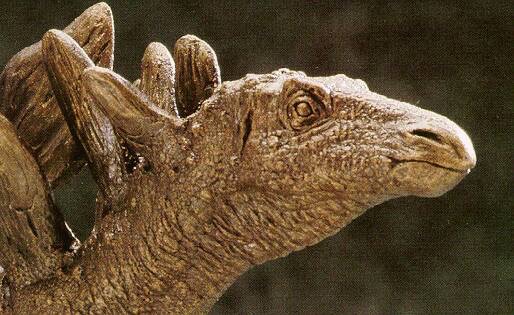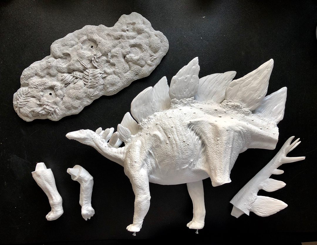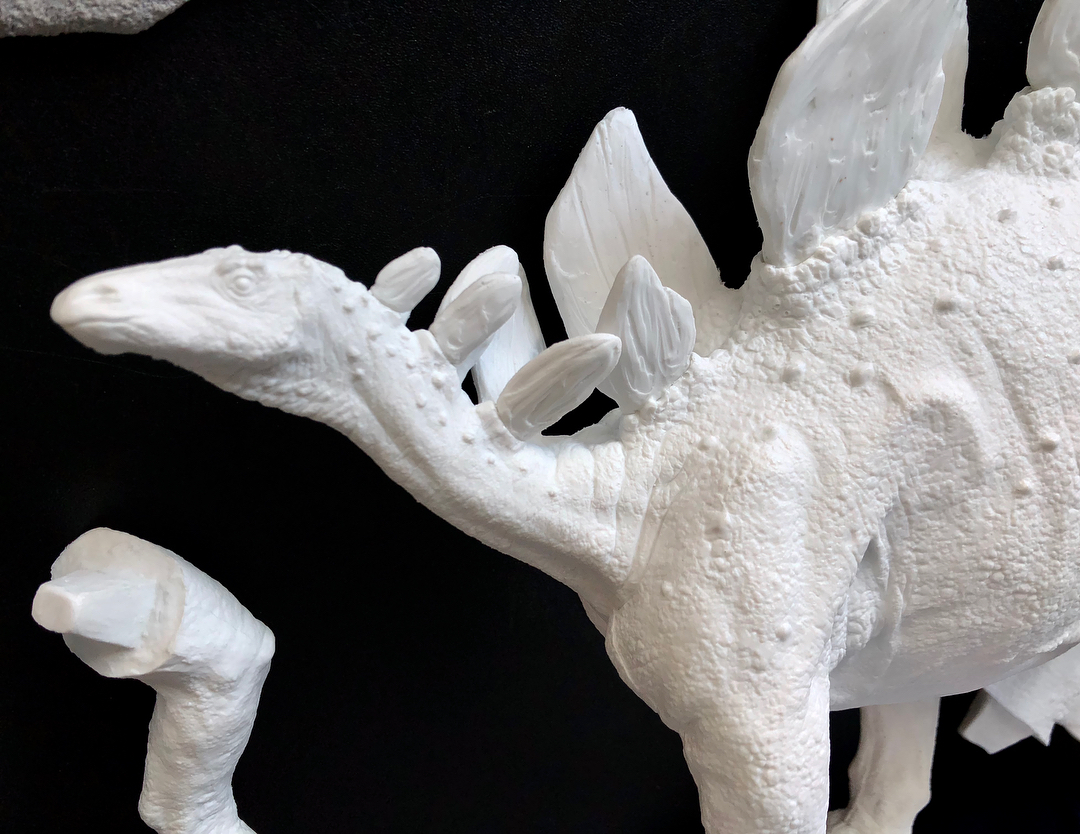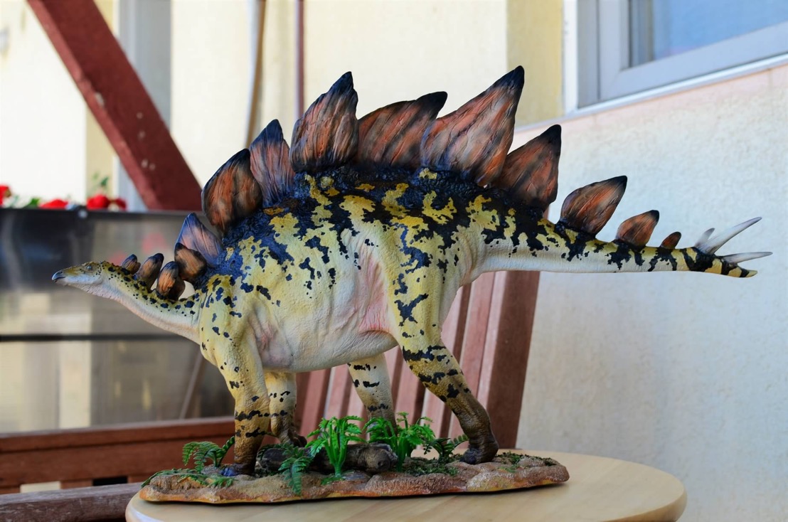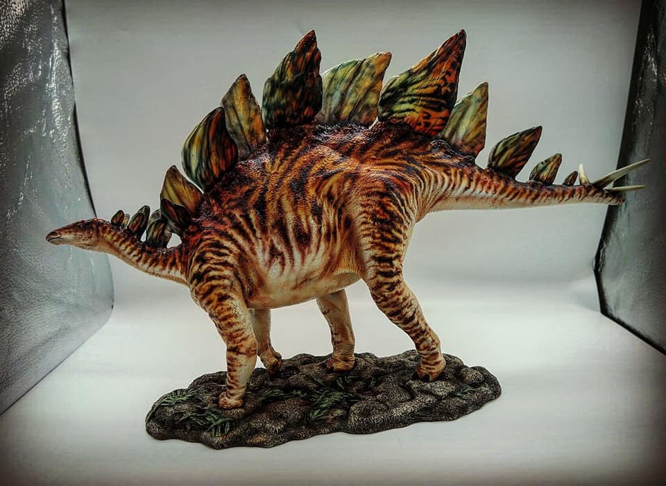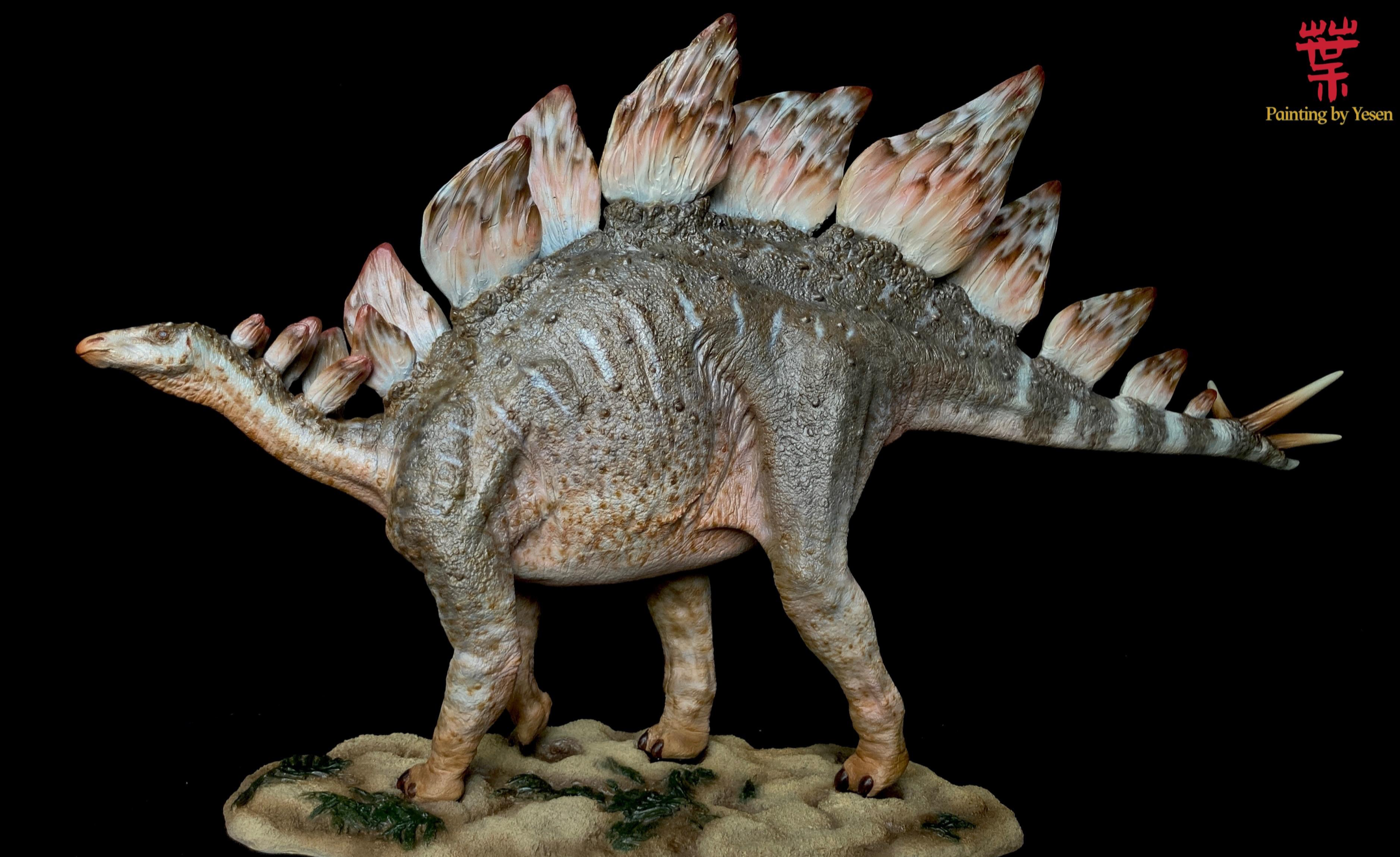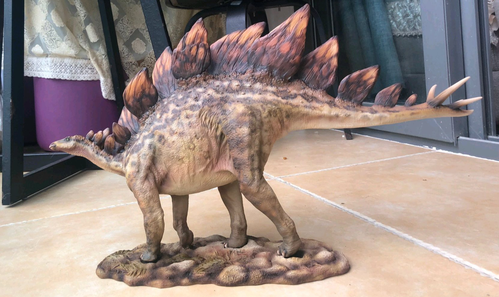 This 30" long Stegosaurus stenops was done around 2014 I think and I decided to just indulge myself and add various protective armaments that would seem appropriate on a large herbivore wandering through a world filled with packs of hungry carnivores. As far as I know, there's no fossil evidence for any of these dermal protections, except for the heavy scales on the throat.