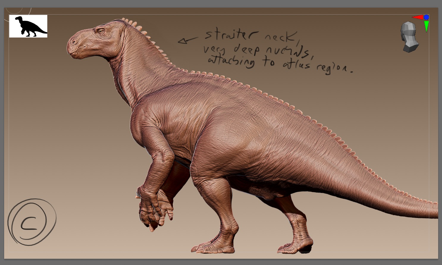 I was corresponding with Filippo Bertozzo about possibly building out nuchal ligaments to make a deeper hadrosaur type of neck. Here are a few paint overs I did to see how things would add up. I don't know which way I will go, but I thought it was worth showing everyone and getting input from the paleo community.