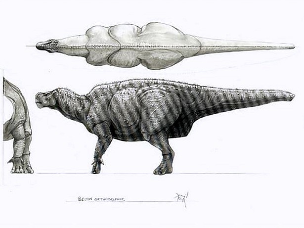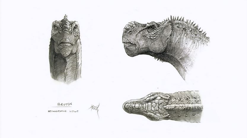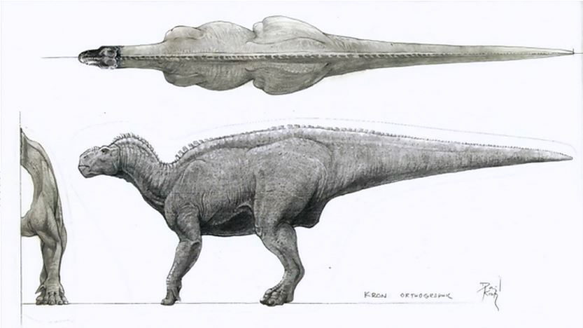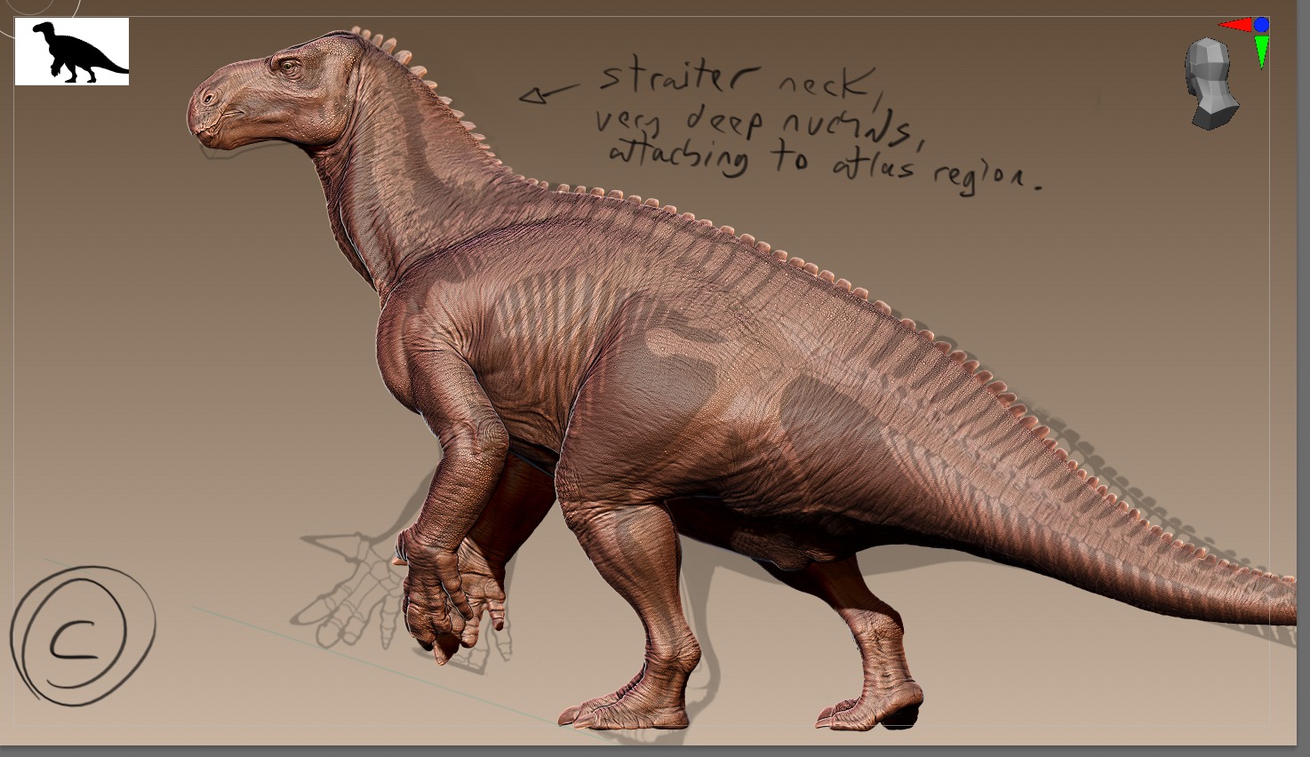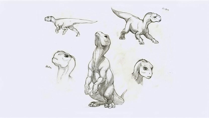 A. That's overthinking it. We just started with I.bernisartensis and changed the silhouette so they characters looked with different. Of course I looked at other Iguanodonts and hadrosaurs that could inspire the correct feel. Kritosaurus always felt so noble to me, hence Kron and its possible that Altirhinus was looked at for Bruton, but it was more organic than choosing a different species for a different character. Disney is a massive organization and everyone had to put in their two cents in order to justify their jobs