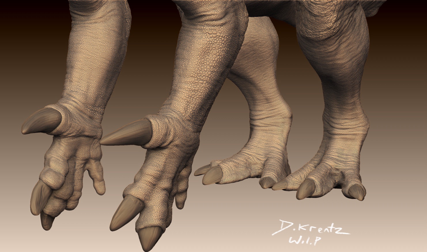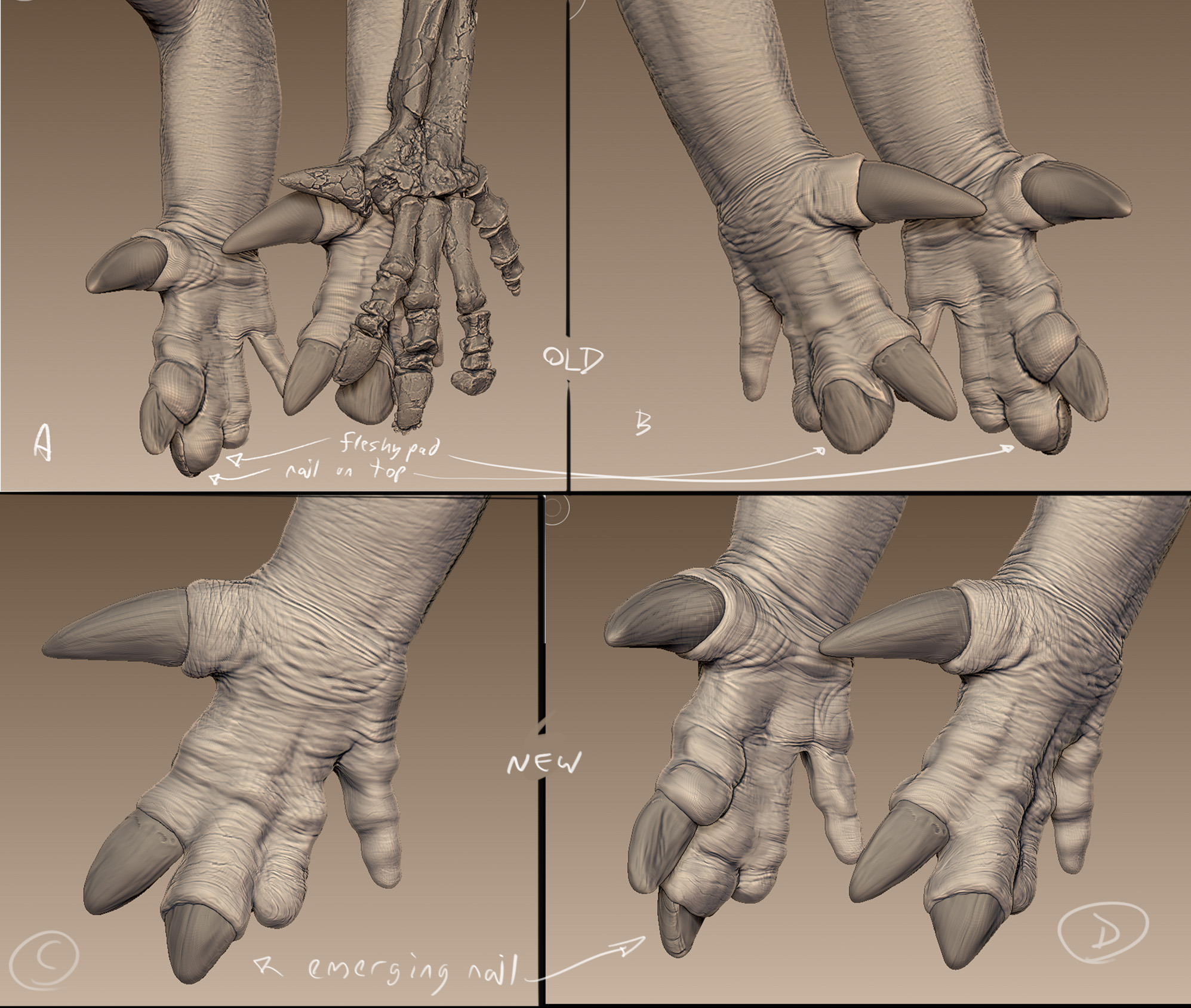 A. The first two images A/B was where I started, with the nail lying on top of a great big fleshy pad. This was rejected by my advisors. the next two images C/D show a more traditional ungual emerging from the tip of the digit with far less pad which was approved. Looking at this now I'll make the transition between digits iii and iv less obvious. Also, keep in mind that the hands on this model are lifted off the ground. When they are planted they would take on a very different shape!