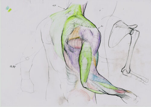 : My simplified colour coded system keeps each muscle or muscle group separated mentally, and gives you a way to colour code your study of any reference you choose to - in the course I suggest colour coding life drawings, tracings of photoreference or figures from imagination - consistent colours help you to stay in control of the masses.