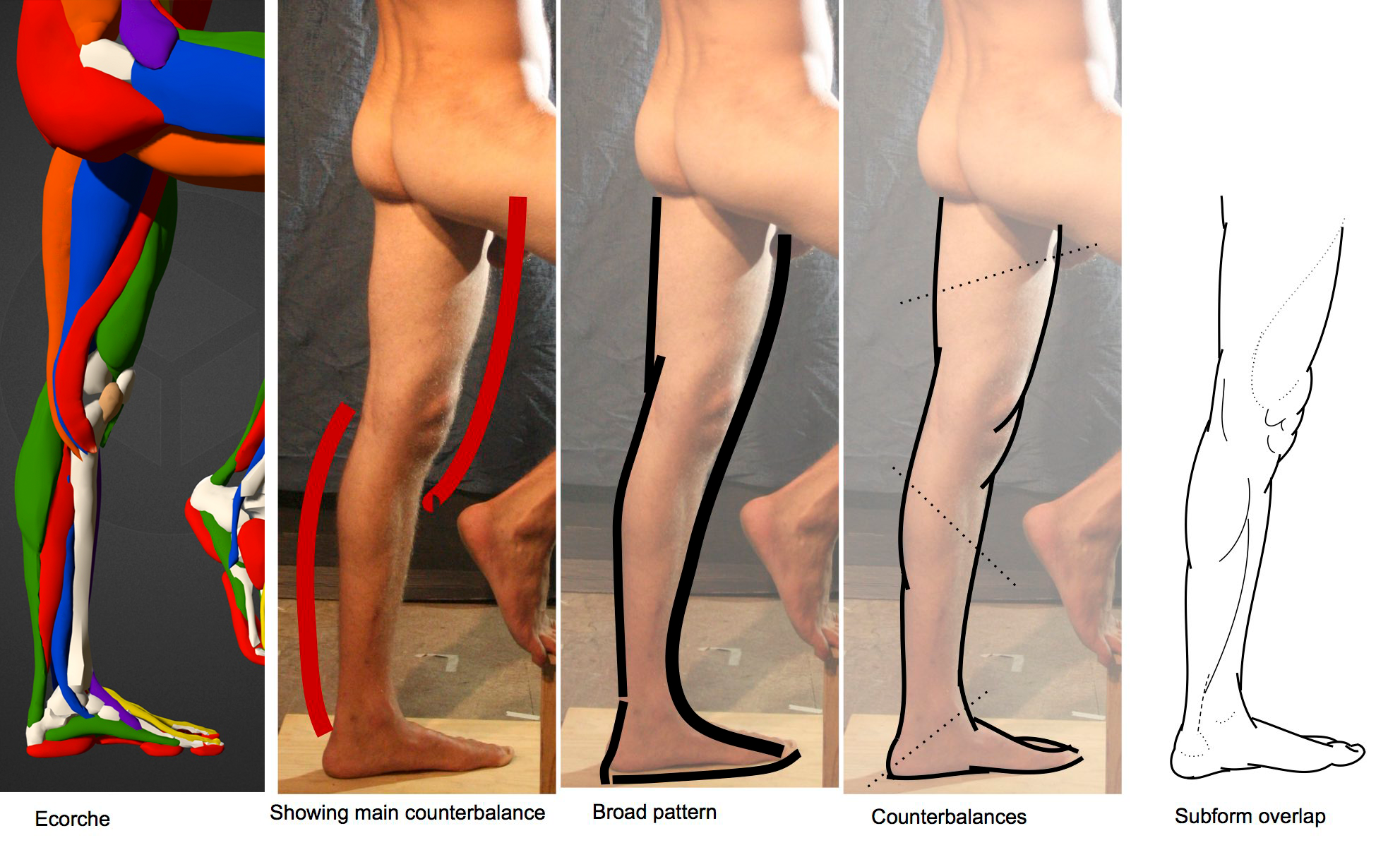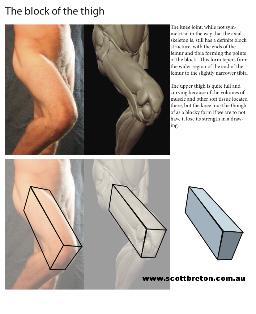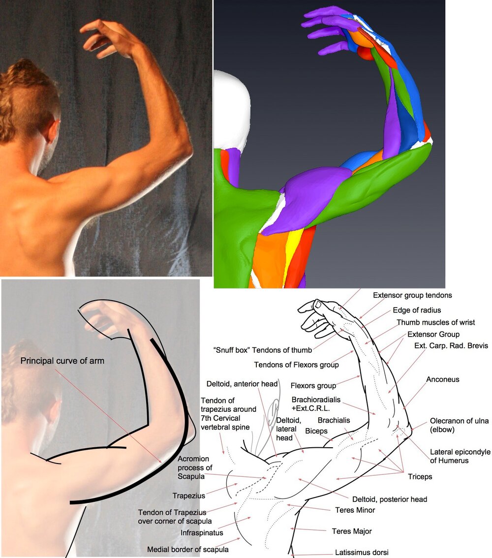 : These forms are simplified where appropriate - for instance, in the observed human body, the forearm flexors are usually seen as one general mass, rather than the multiple small muscles that compose this group - and the shape of this group as it interlocks and flows with other forms of the arm is what we are interested in as artists