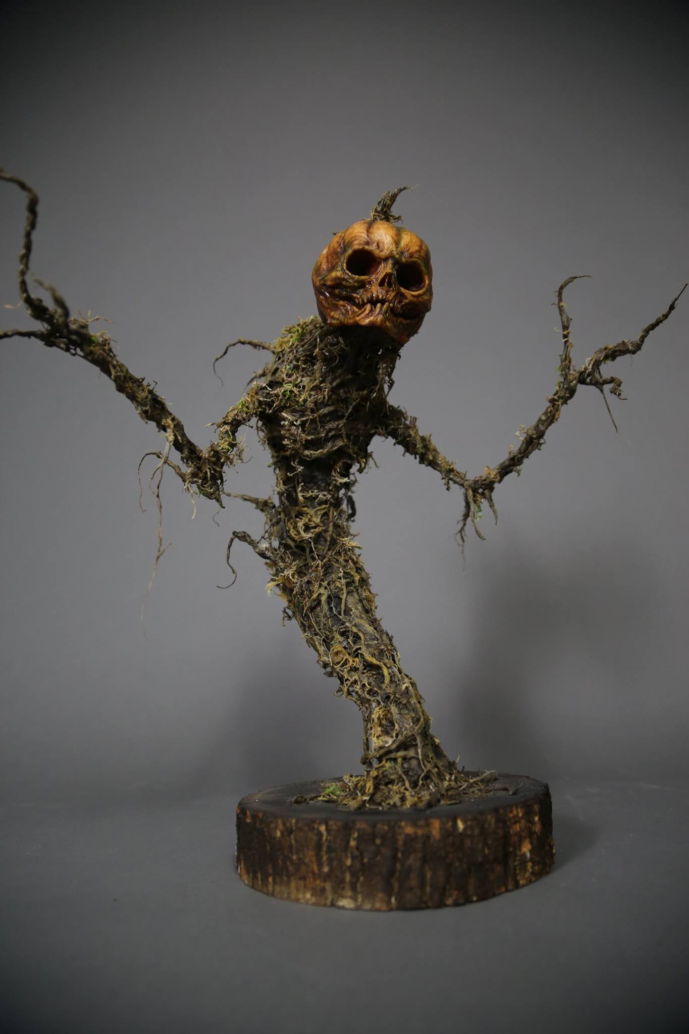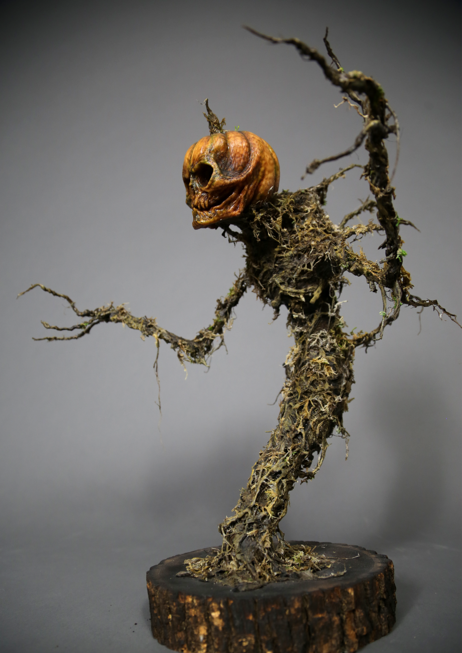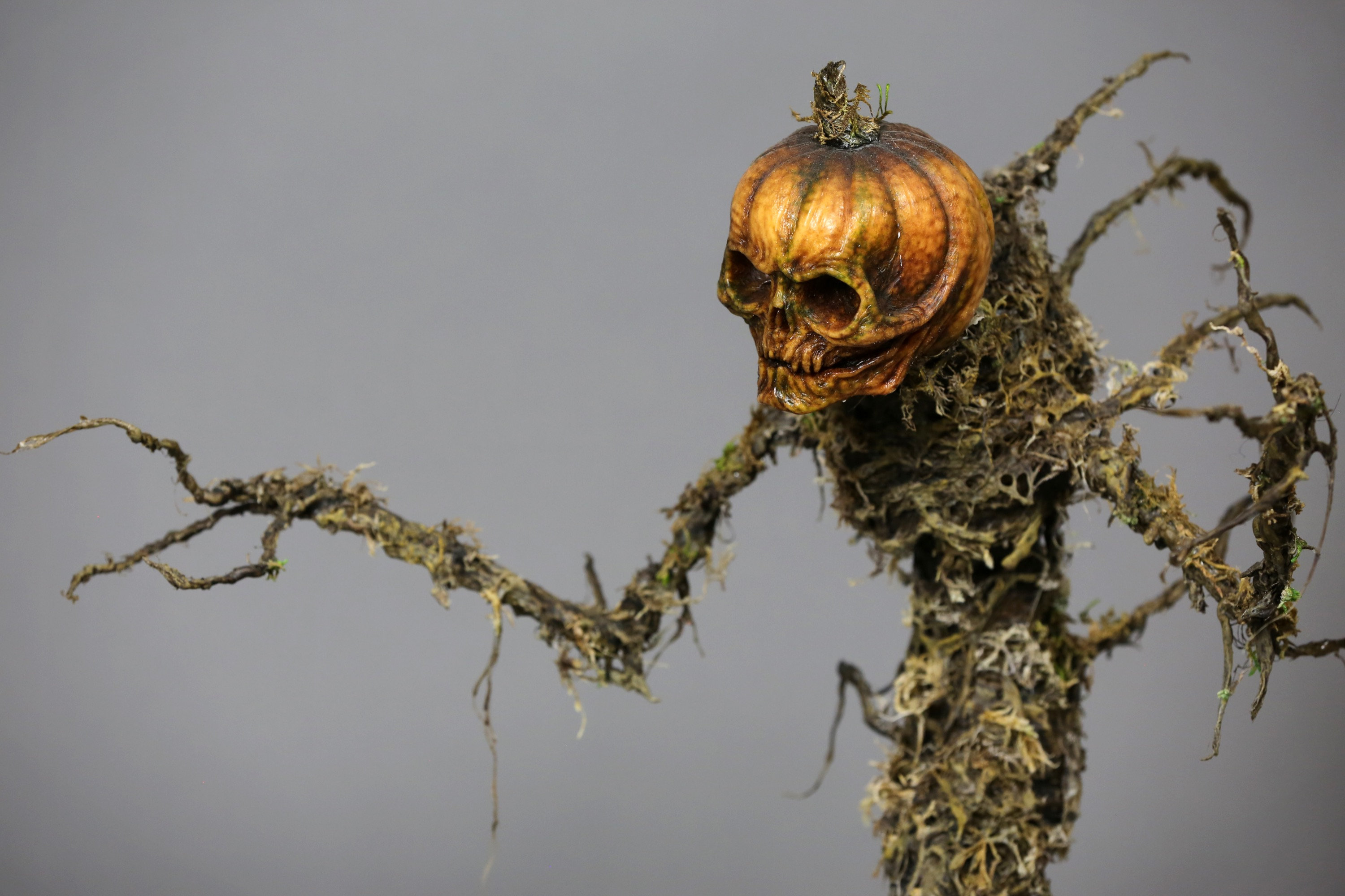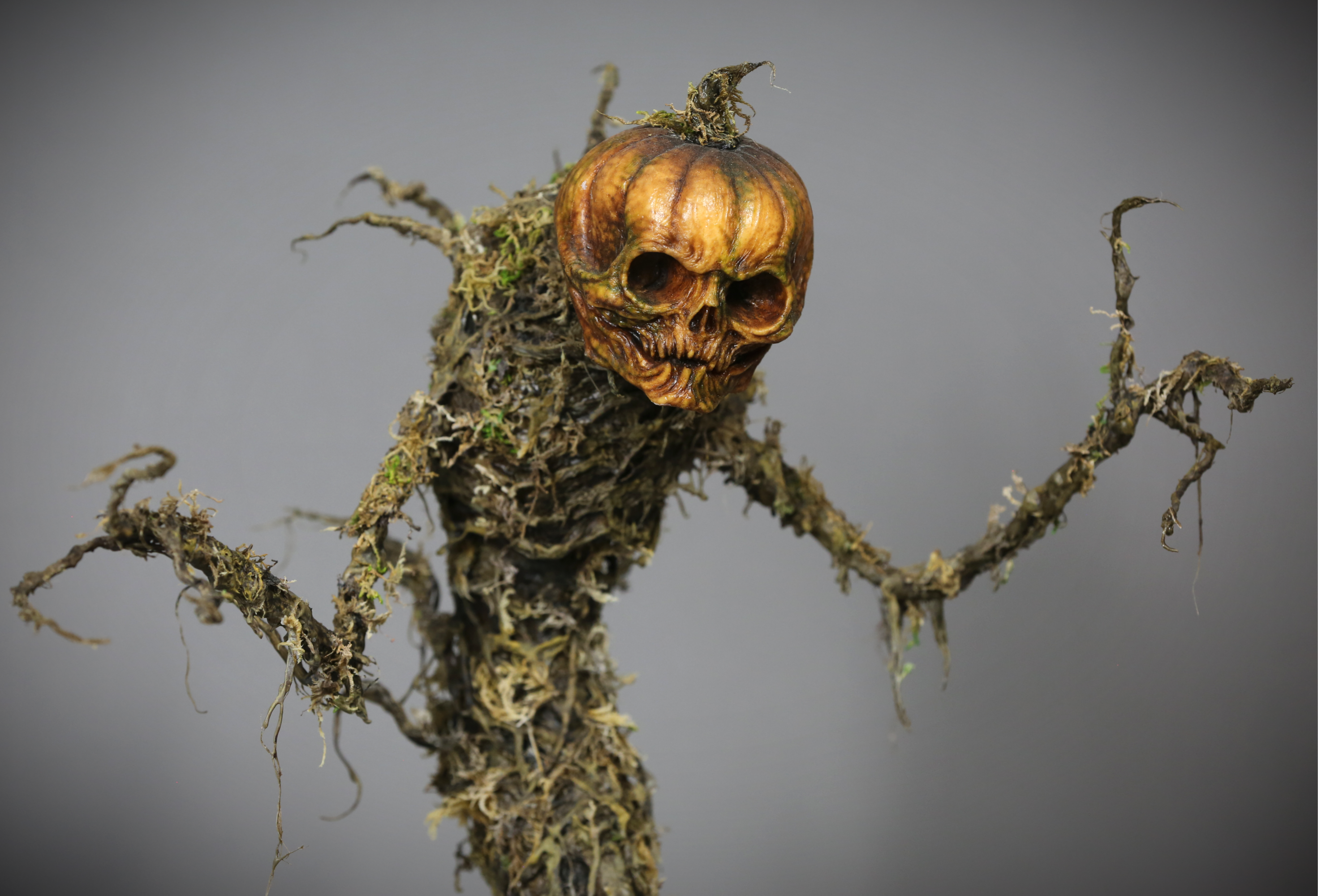 Using castings from our original mini pumpkin mold, Oswald comes to life in these one of a kind characters. His head is made from a dense urethane, his body is vines, wires, and moss. This character is not out of a mold, slight variances will occur. He is about 16 inches tall on his 1.5 inch tall base. His wingspan is around 17 inches.