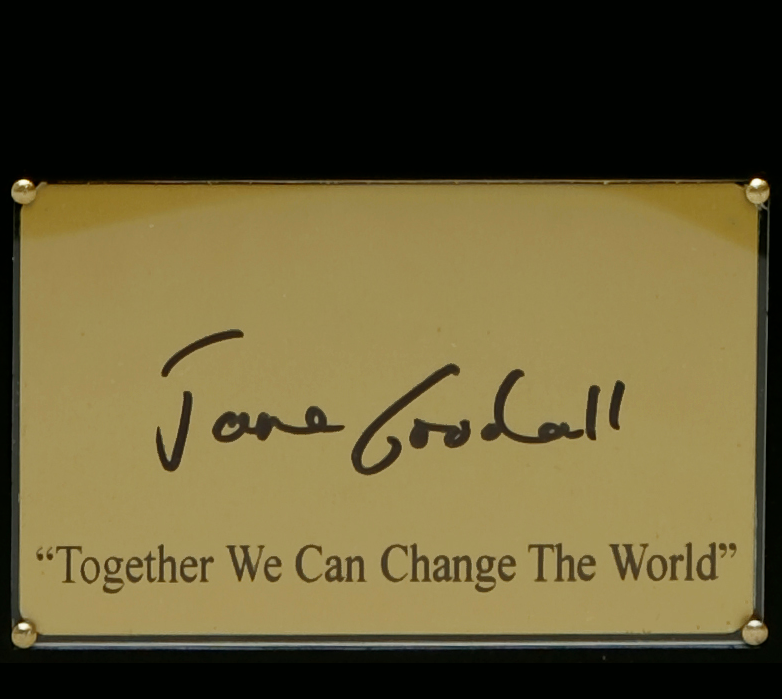 Dr. Goodall's famous quote "Together We Can Change The World" is inscribed on the front plaque beneath her signature. The back plaque is inscribed with an informational legend and the edition total of 200, and each piece will be individually hand-numbered until the edition is sold-out.