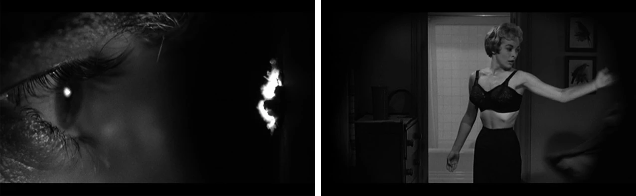 As filmed, the scene closely follows the storyboard, and all of Bass’s images were probably shot. In the final edit, Hitchcock left out some images and moved others around, but the resemblance between the original design and the finished sequence is quite remarkable, especially for Hitchcock, who greatly relied on creative editing. Visual clues are the overall modernist design sensibility of the piece as well as more specific imagery, such as the transition from the drain in the bathtub to Leigh’s eye, which recalls the unsettling eye in Bass’s Vertigo title sequence and the huge eye in Bonjour Tristesse, while Leigh’s desperate outstretched hands recall those of concentration camp inmates in the opening of The Victors. The circular form of the showerhead and drain are seen in several Bass titles, including Attack!, Walk on the Wild Side, The Victors, and Grand Prix, while the Walk on the Wild Side sequence is a good example of the power of the close-up in a short, tight sequence.