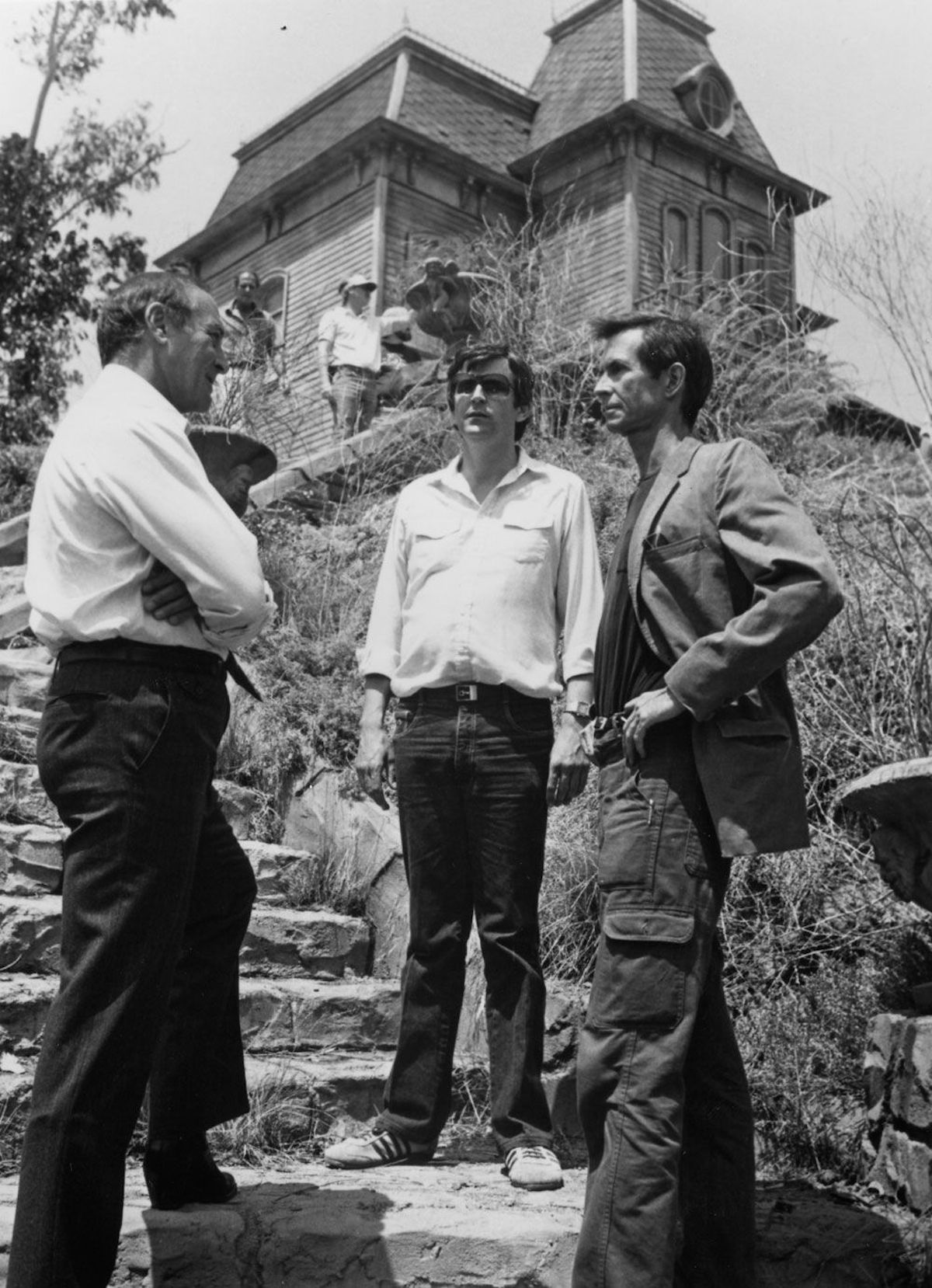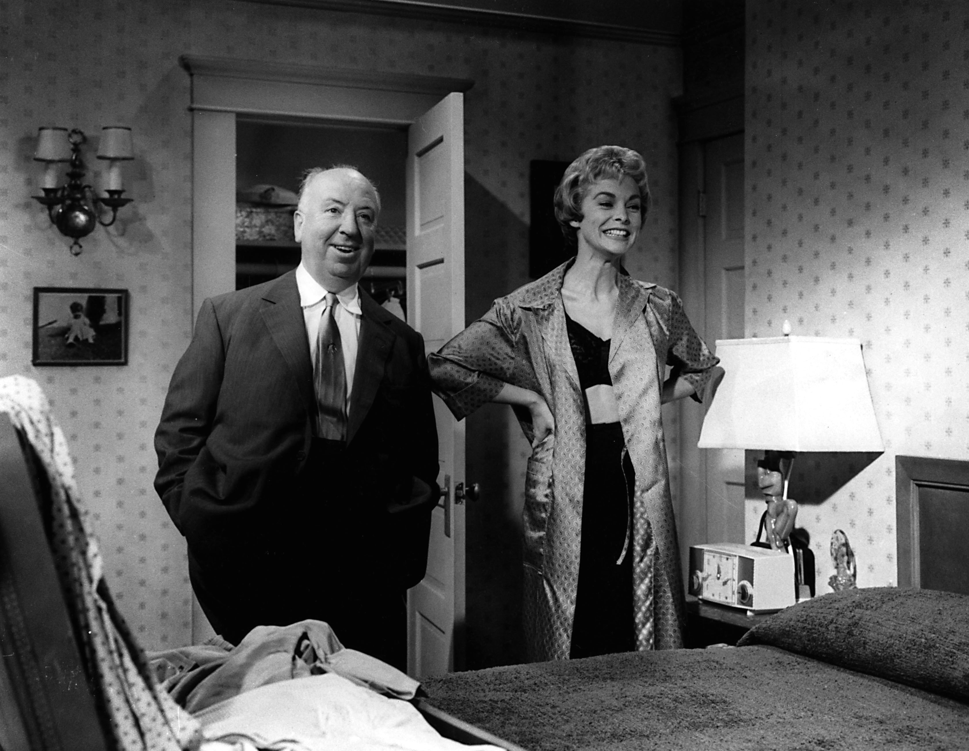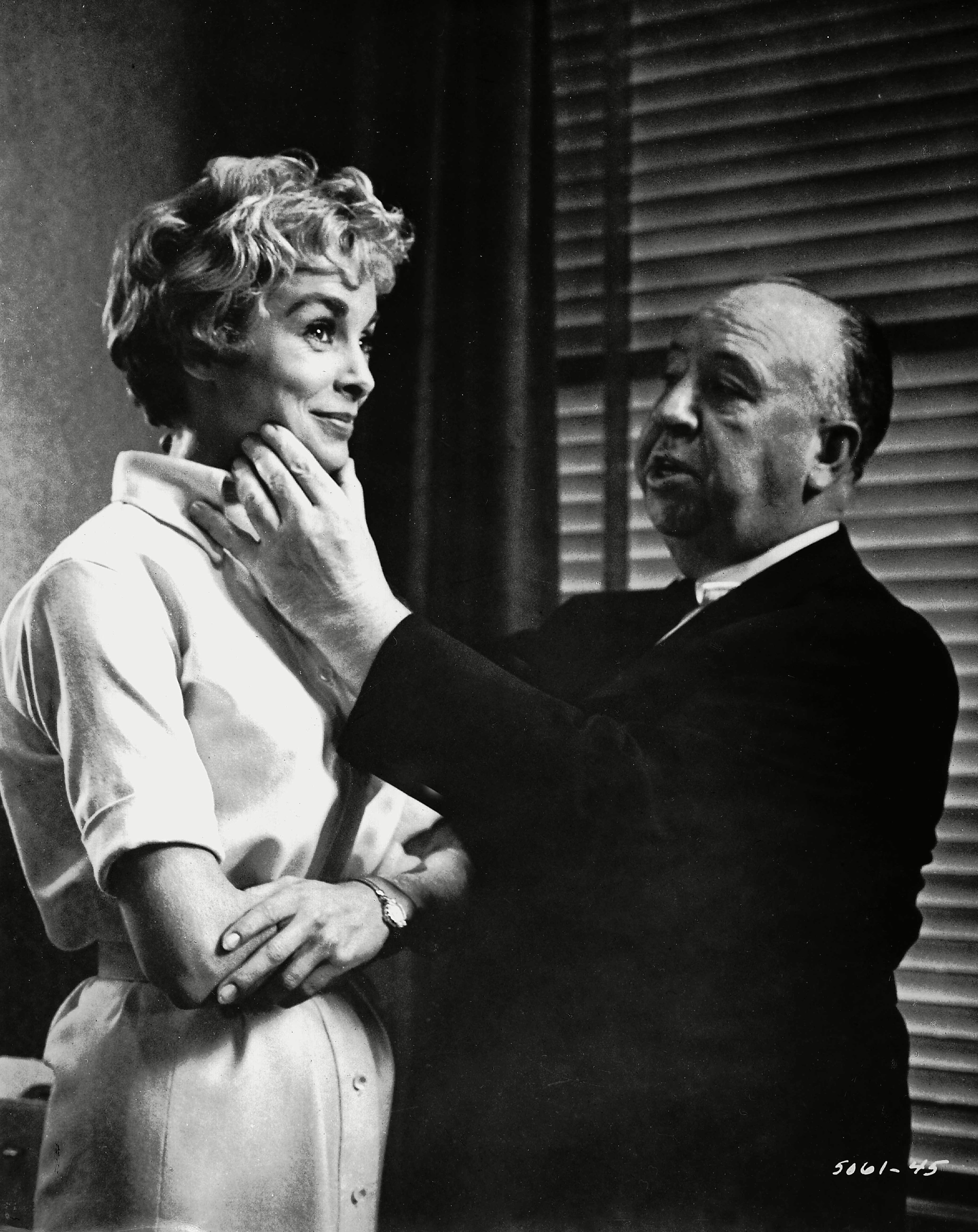 Contact sheet of photographs taken on set of Psycho: Saul Bass, Alfred Hitchcock, and Janet Leigh, 1960.