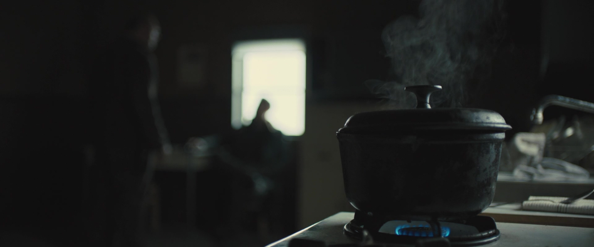 Deckard (POV) as he looks over interior / (POV) Pot boiling on stove-CAM moves back.as....