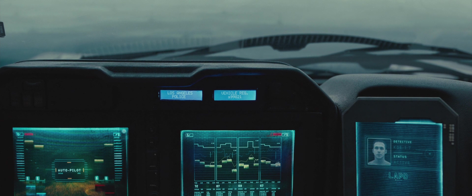CAM follows D.-He attempts to pet dog-Dog backs off-D.enters spinner / (POV) Deckard-Spinner INT. rises/Monitors show dog, tree,& farm.