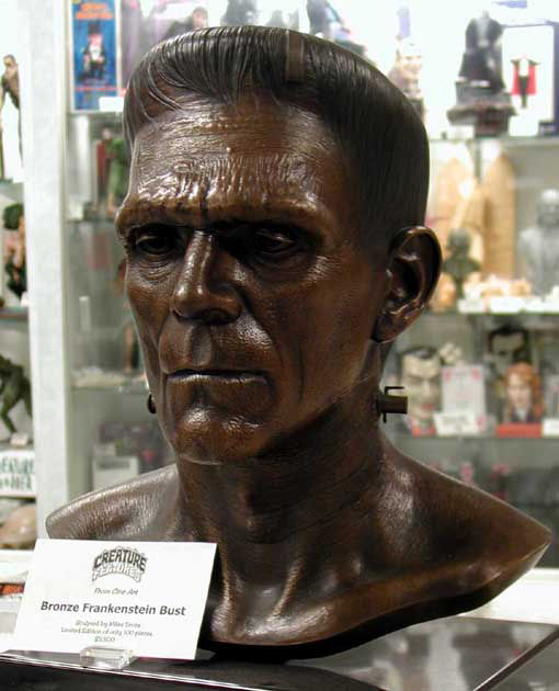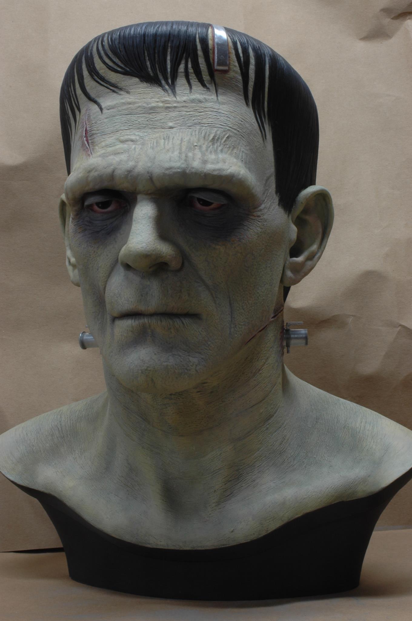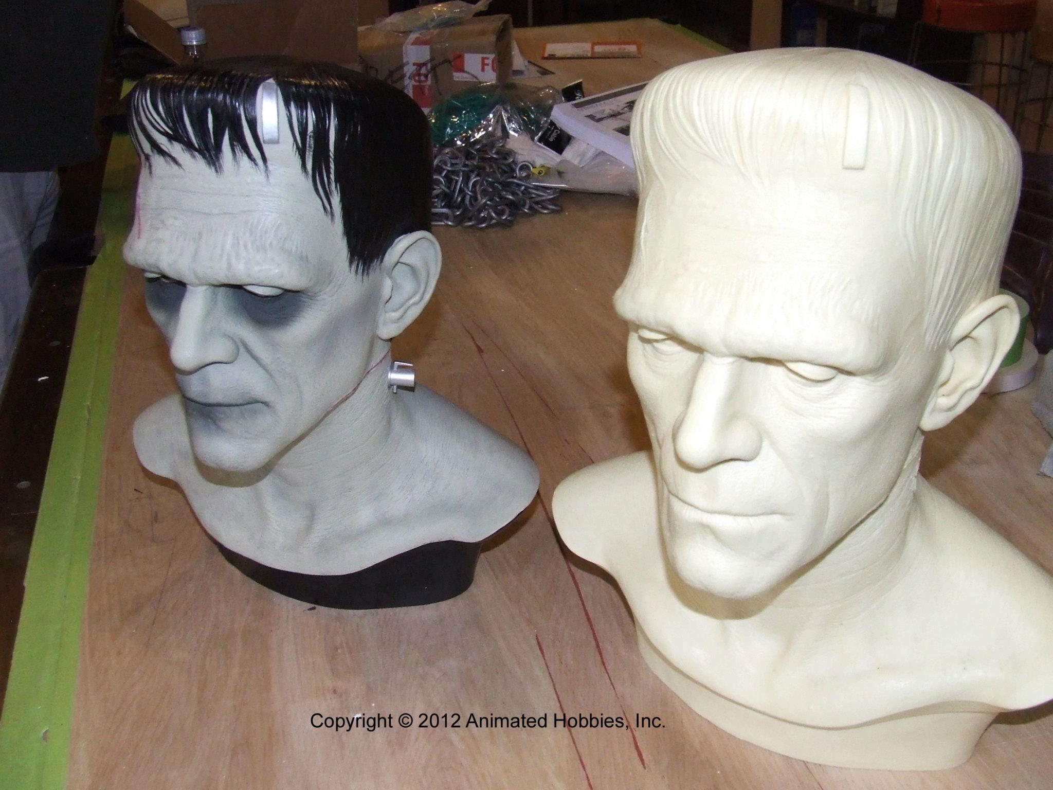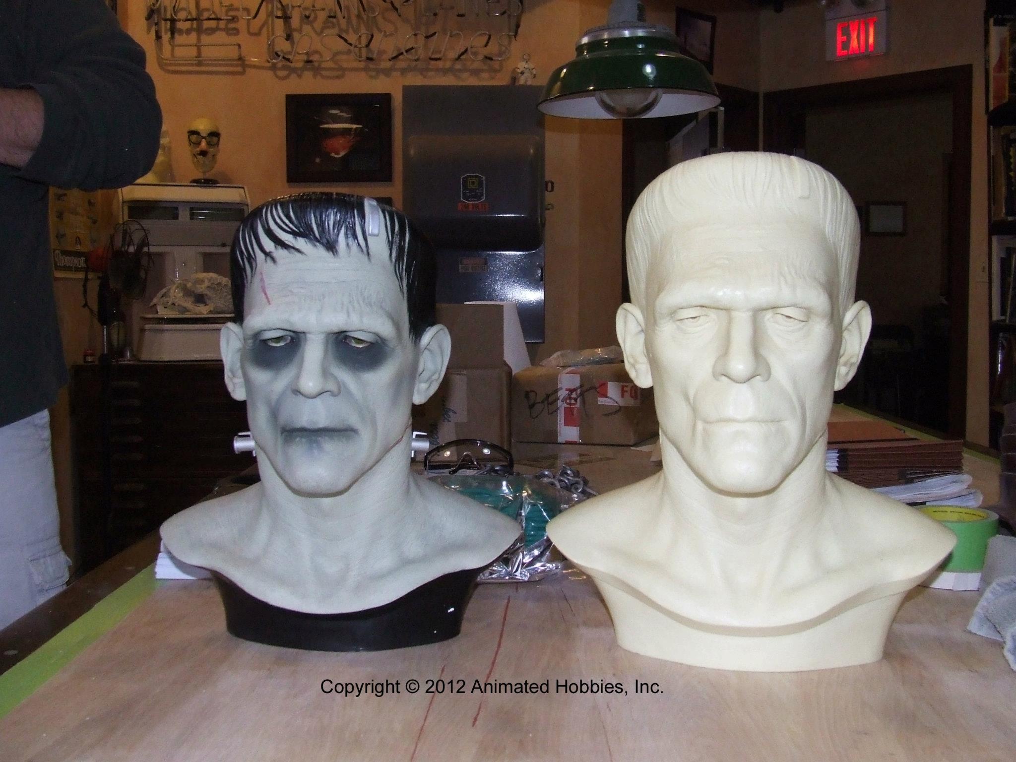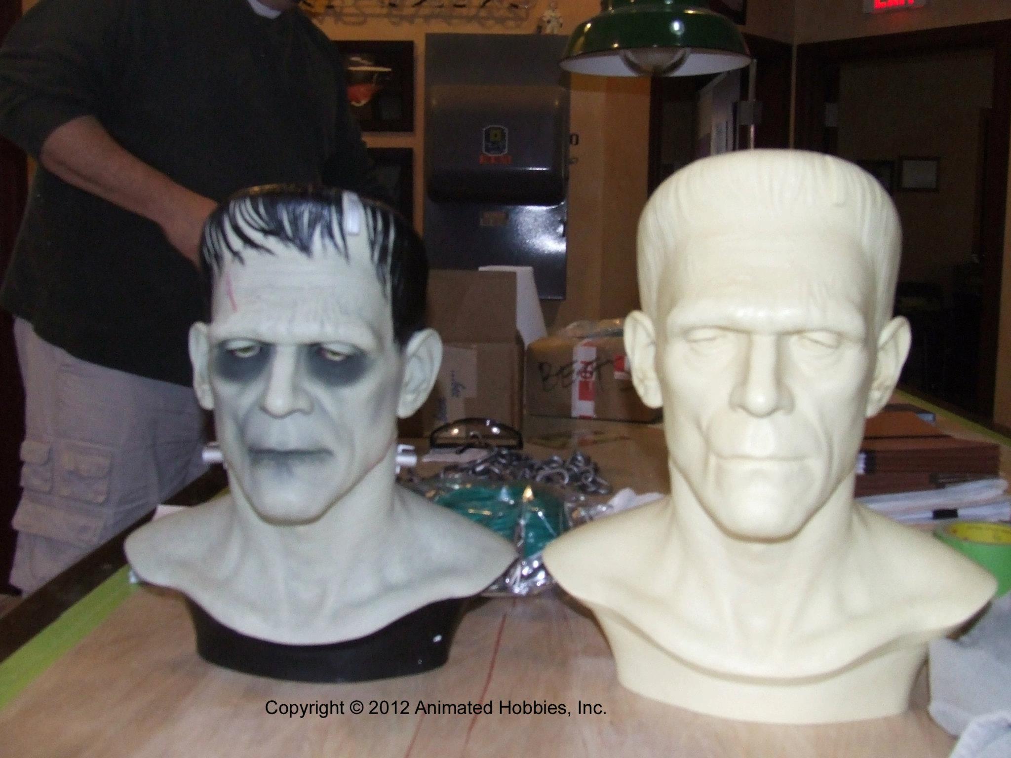 In addition to regular 100% life-sized unpainted resin Frankenstein model, CineArt made finished versions (with and without real hair and glass eyes), a full-body life-sized figure with optional programmable eyes that would follow any motion in a room, and a real bronze bust.