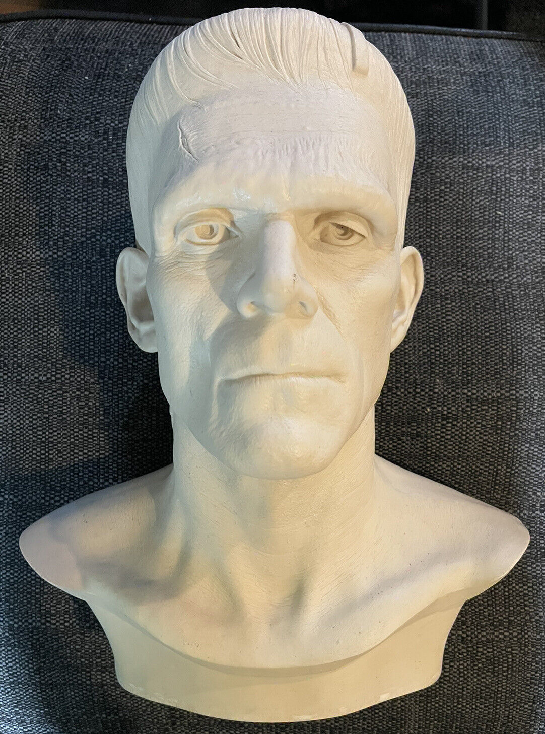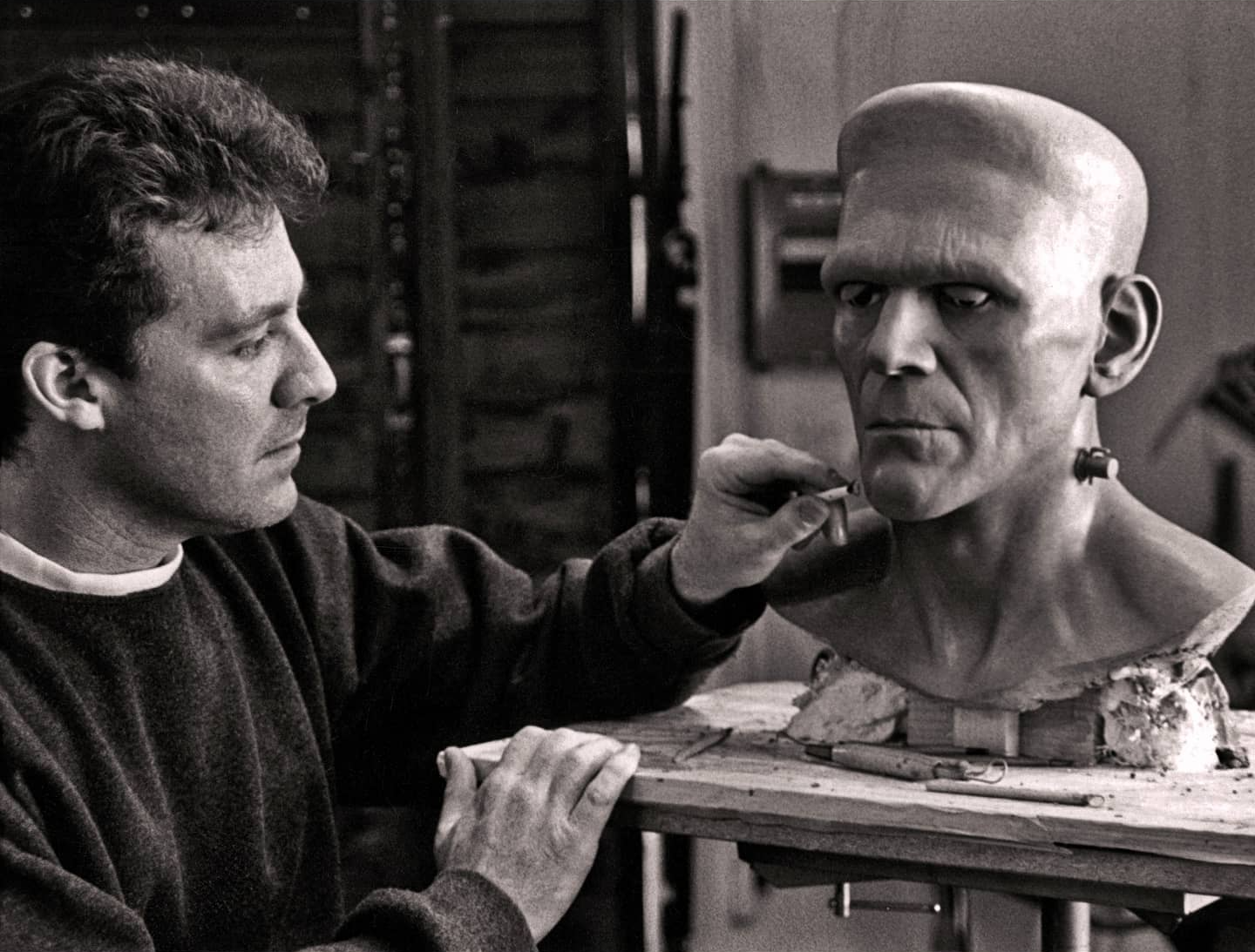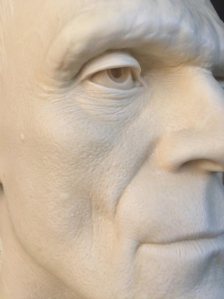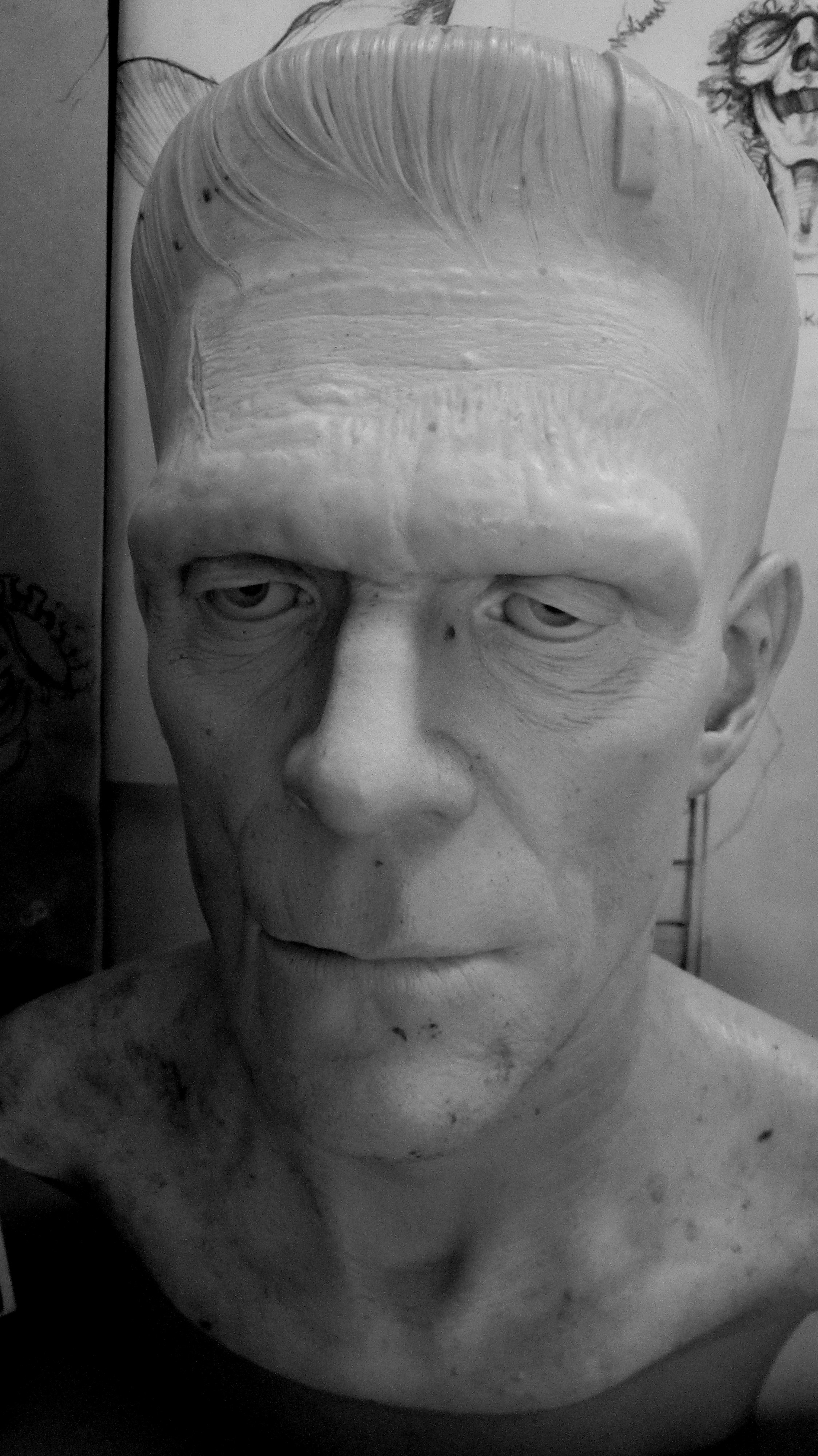 Struggling in 1995 to find the likeness and proportions with a few photos I could find in books, and glossies I could scrounge from Hollywood Book and Poster. Pre internet. And foolishly using Chavant NSP Hard clay in a cold garage in the middle of winter! I had yet to learn that one should always use the softest clay possible for any given project. It sure was both a challenge and a pleasure to dwell on the photos, peering back through time to try to understand this famous makeup, and to do honor to both Boris Karloff as well as the indelible and oddly ingenious artistry of the great Jack Pierce. I never did quite get the likeness right. One day I hope to have the chance to revisit this bust and nail it as well as did Madame Toussade's in their version, only with more detail. Thanks again to Gino Acevedo for recommending me for this gig and being a great art director.