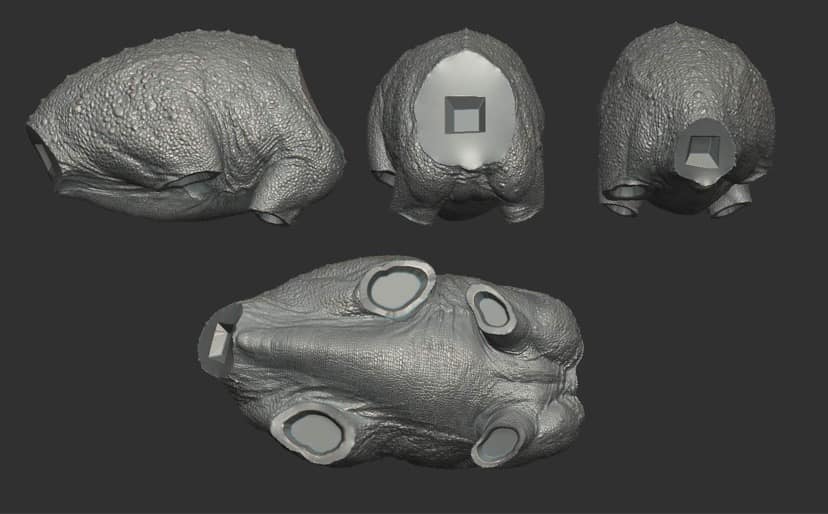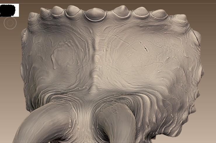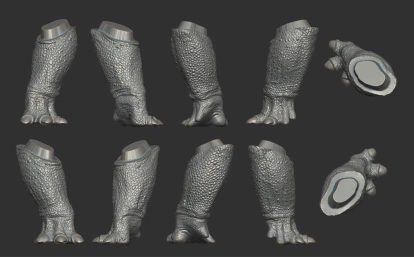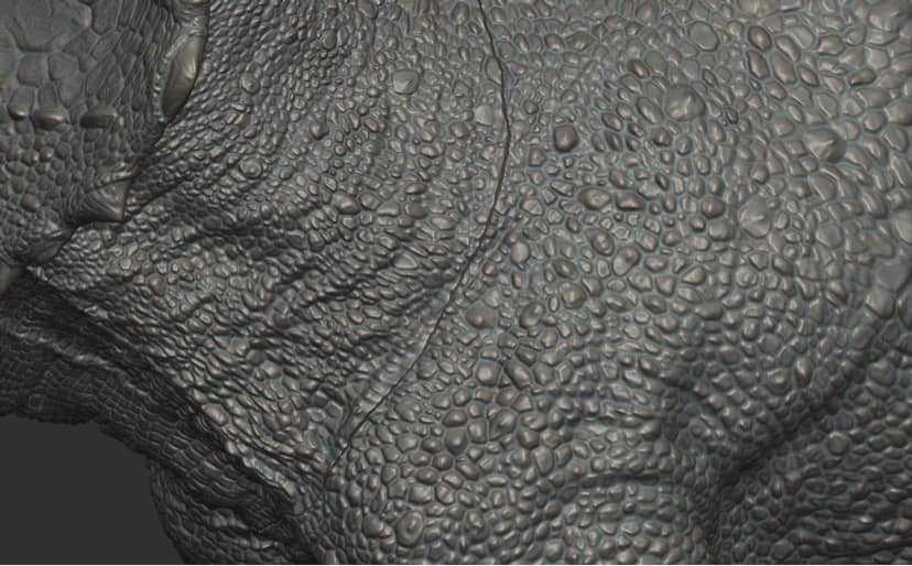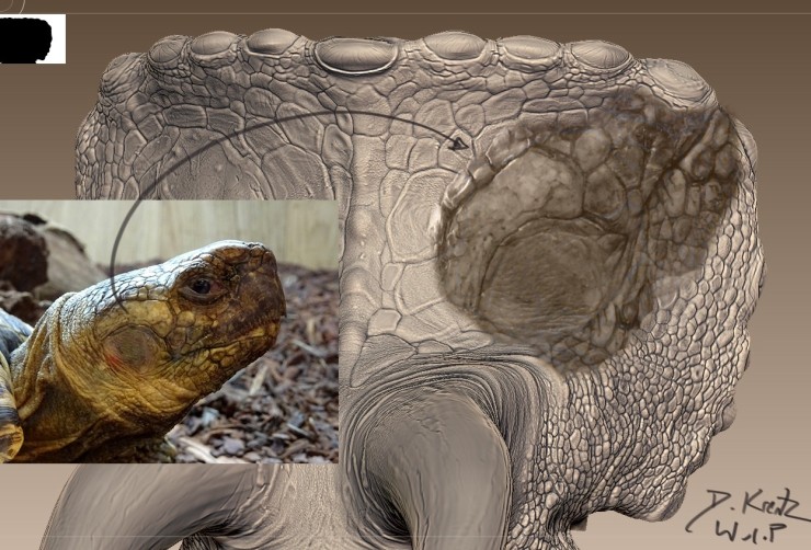 While working on Uncle Beazley I was able to use the amazing fossilized skin of the “Lane” specimen as reference. I overlayed photos of the skin slabs on top of my model and tried the best I could to get the correct placement and size. It is still shocking how big some of the those scales are! I enjoy creating dinosaurs that have lots of wrinkles, muscles, and bones on the surface. My early version of the ZBrush model looked super muscular, yet when I put on the large scales, much of that detail disappeared. It took a while for me to get used to it but I guess that's just how it goes. Making tiny little wrinkles laying on top of big scales would not have looked great anyway.
