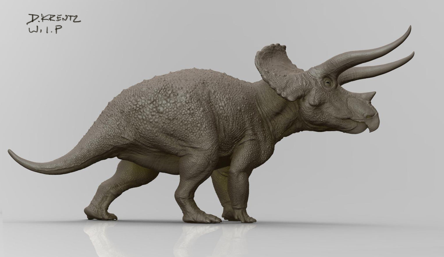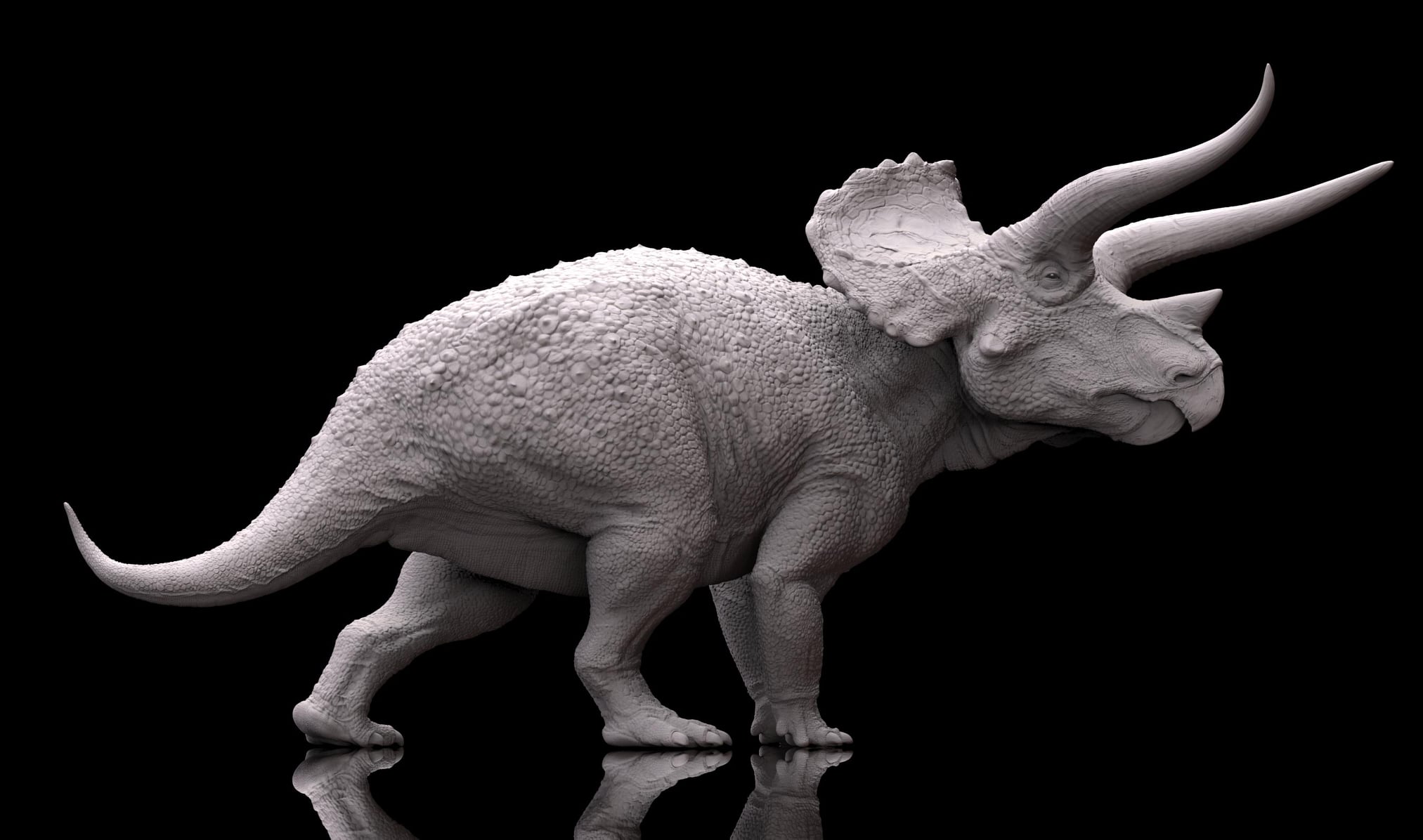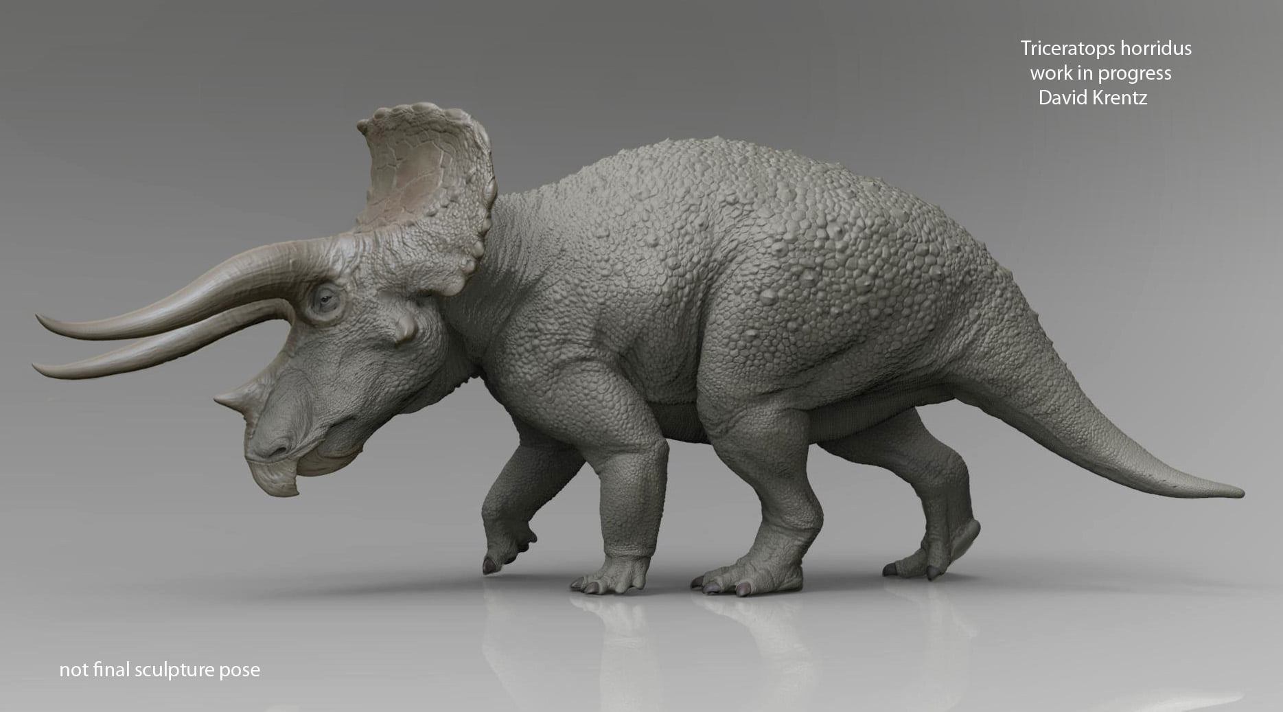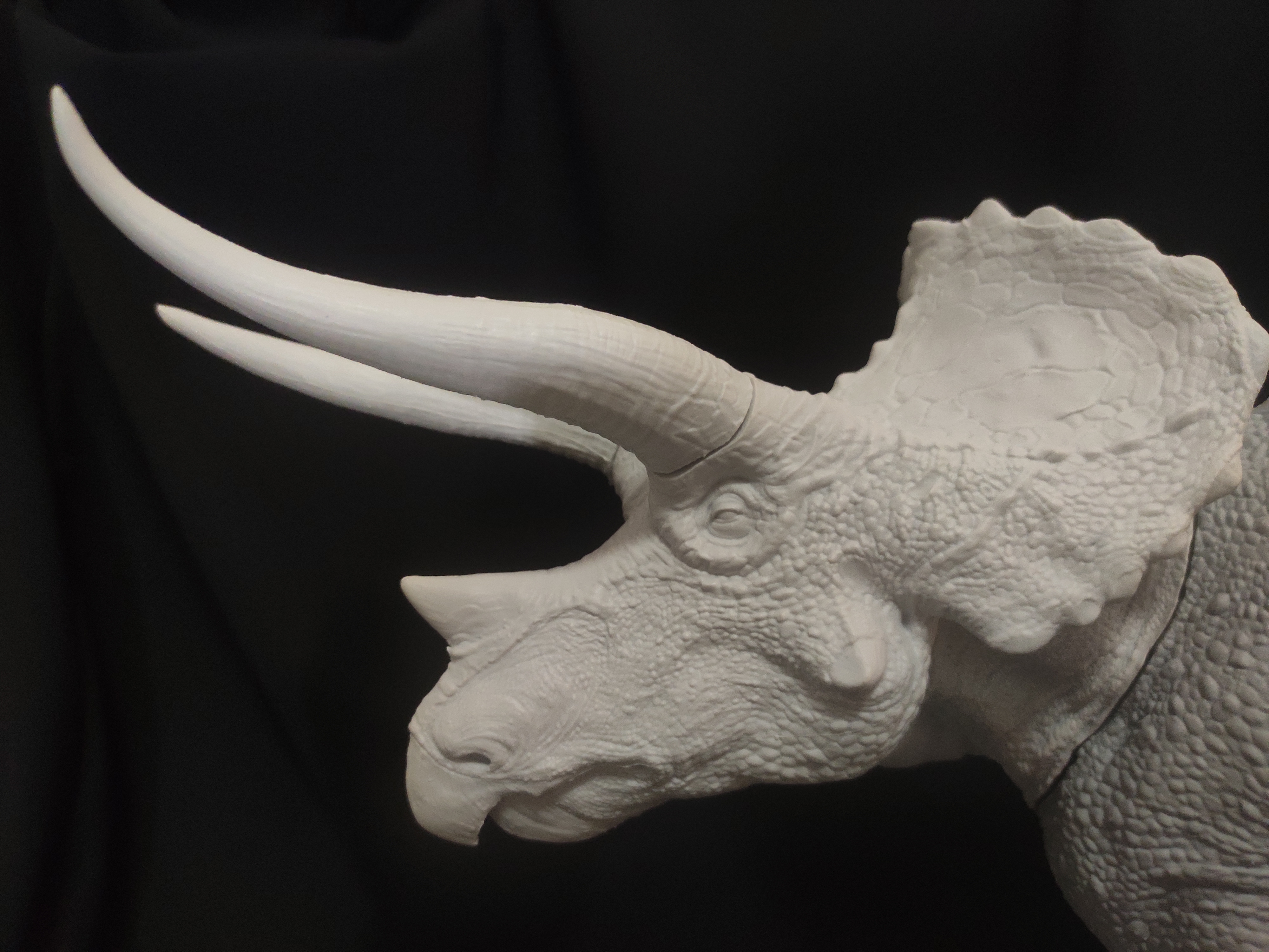 : 러프하게 포즈를 잡았다. 뿔 부분에서 미묘한 차이가 엿보인다. 복원도보다 정면으로 향하고 있으며 덜 굴곡졌다. 프릴도 살짝 길어보인다.
