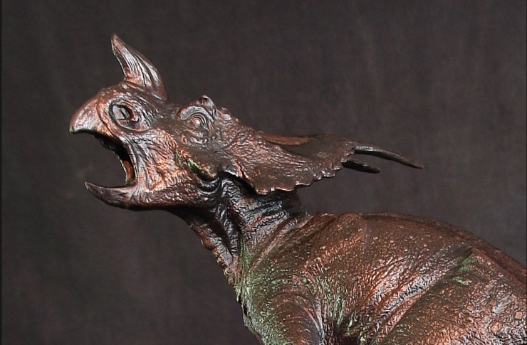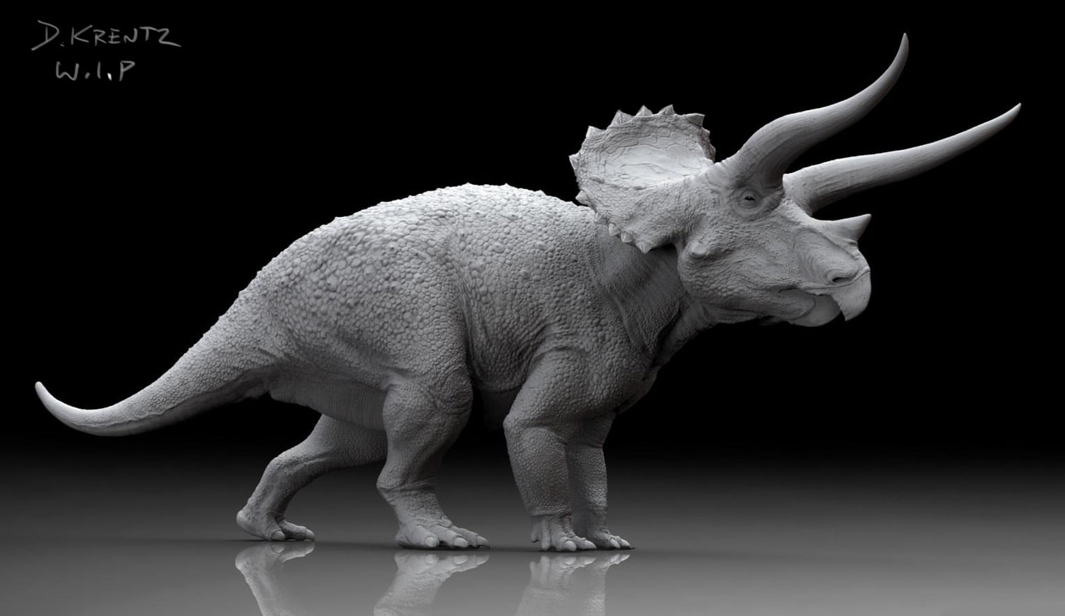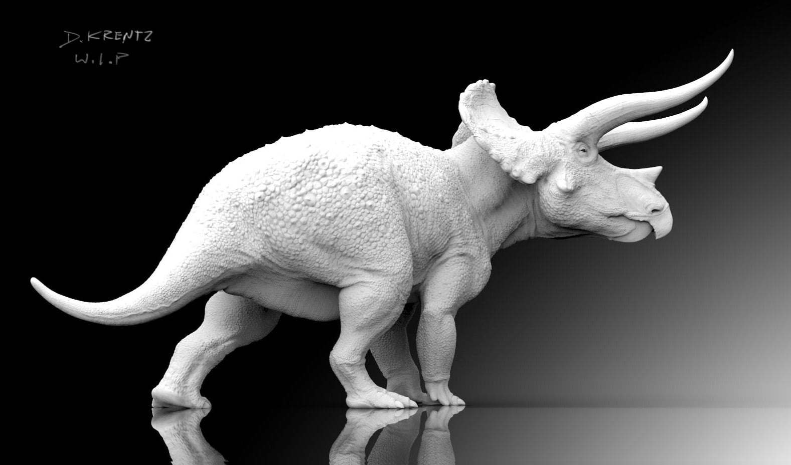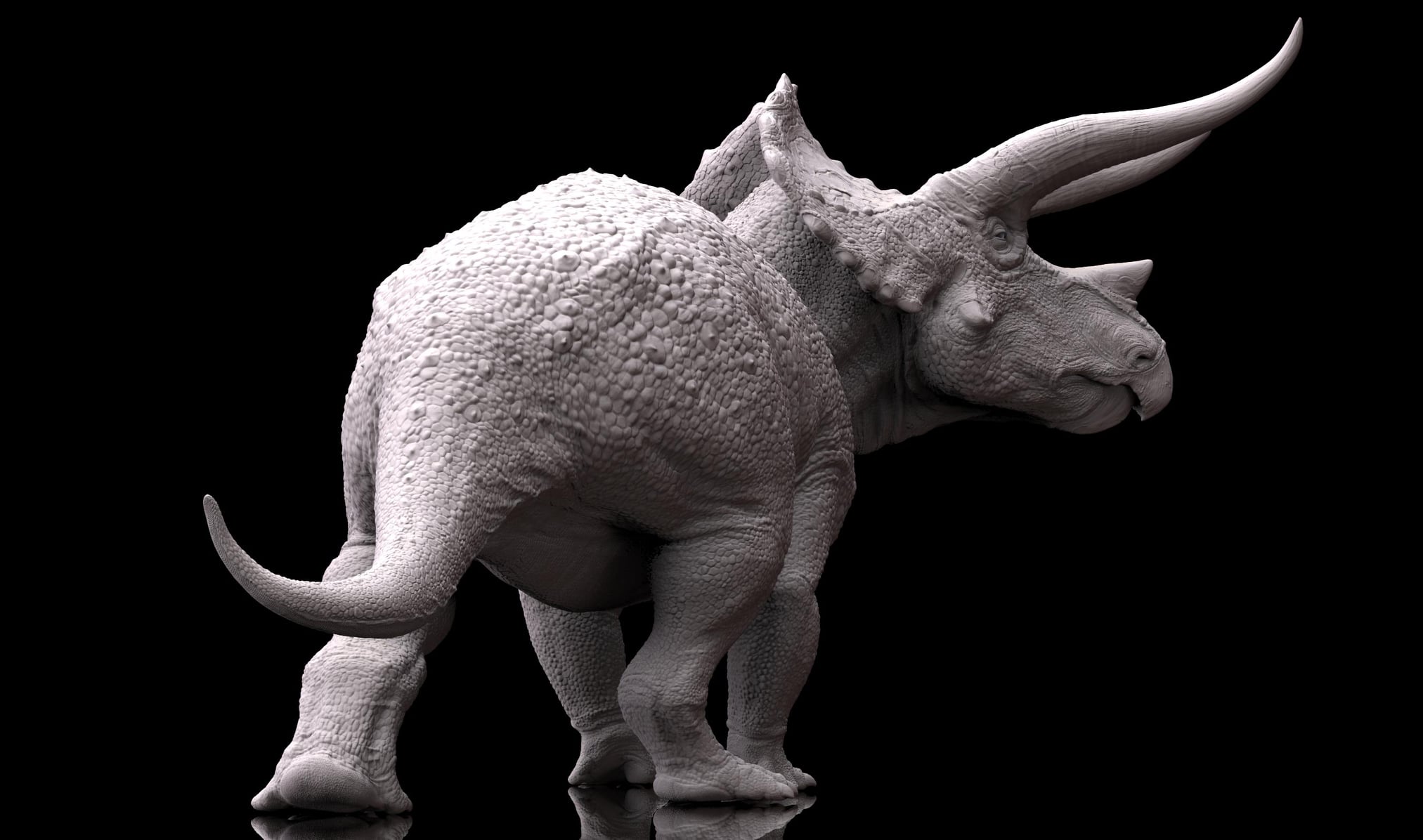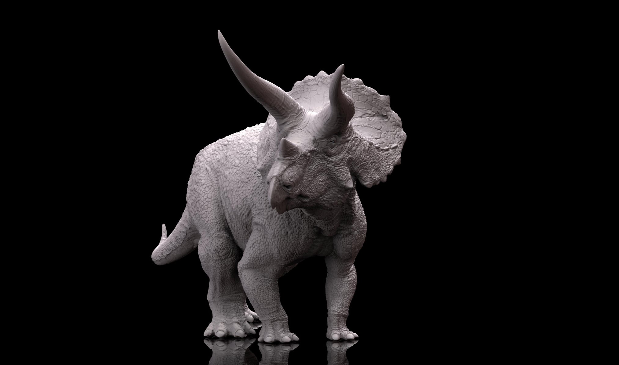 : 러프하게 포즈를 잡았다. 뿔 부분에서 미묘한 차이가 엿보인다. 복원도보다 정면으로 향하고 있으며 덜 굴곡졌다. 프릴도 살짝 길어보인다.