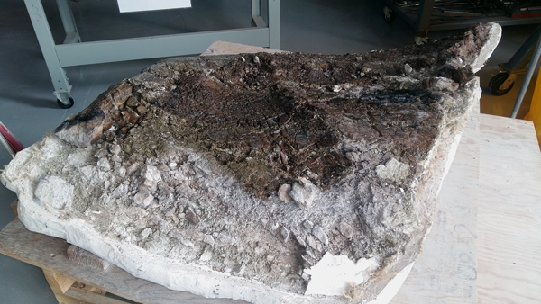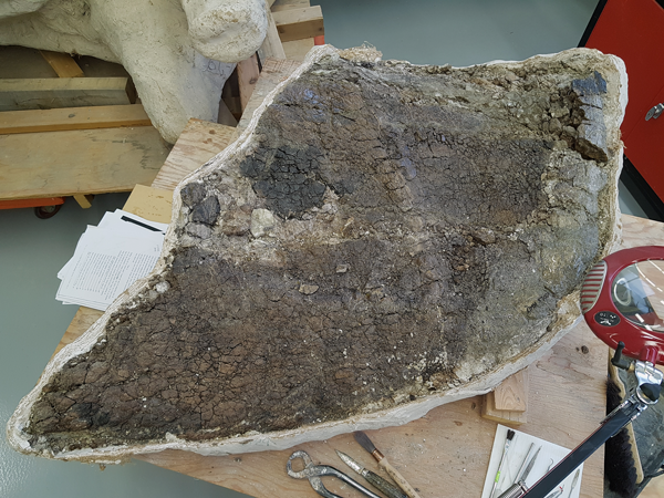 A section of the bony shield that flared out around the neck of our Triceratops specimen, seen here sitting in a plaster jacket in the museum’s palaeontology workshop. The surface has been partially cleaned revealing many fractures. When C. M. Sternberg examined this fossil soon after its discovery in 1929, he made note of its exceptionally large size. Catalogue number: CMNFV 56508. Image: Alan McDonald, Canadian Museum of Nature.