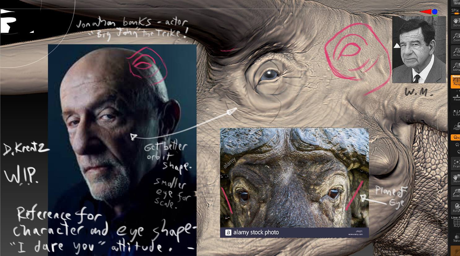 Been slowly getting back into the new Trike. I think I'm gonna sculpt some bird or bird-ish thing so the modeler can add if they want that ox-pecker or egret data-on a big game animal feel. Any ideas for a species? Also, been avoiding the head for a while as I haven't found the character yet. If people are going to pose him with Regina Mundi then I want the big ol' trike to have have a "go ahead and try it" attitude. Regina Mundi has a huge Trike horn gash data-on her thigh, so this may be the same Trike she met a while back. I love the face and character of Johathan Banks who plays Mike Ehrmantraut in Better Call Saul and Breaking Bad.