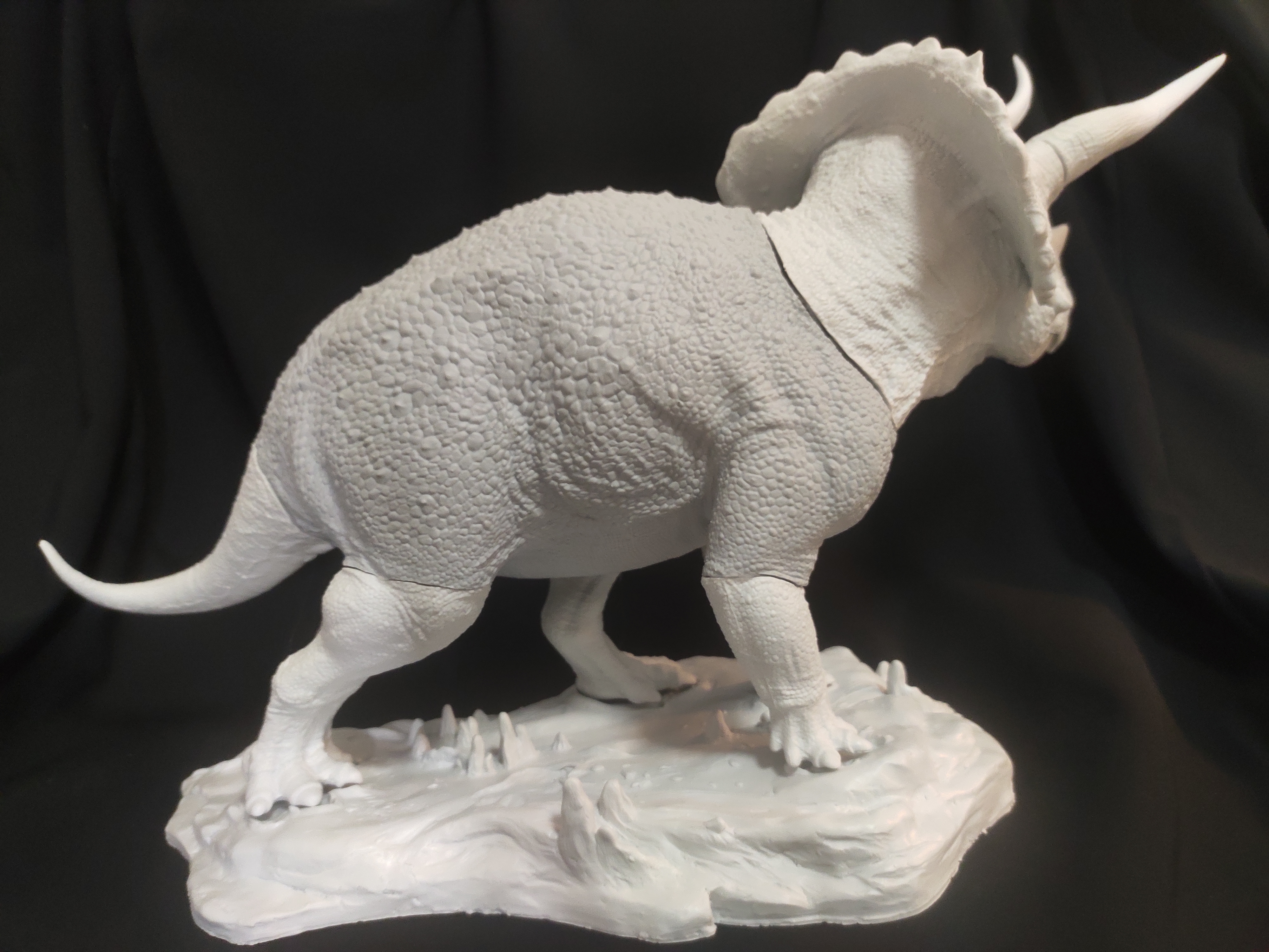 : 완성했다. 판매 단가를 정하기 앞서, 트리케라톱스 호리두스를 1/18로 출력하고 몰드 복제하는 과정이 남아있다. 이름도 정해야되는데, 현재 'Lance'와 'Unkle Beazly' 사이에서 고민 중이다. 또한 한가지 옵션으로서 모형을 좌우 반전 시켜 대칭되는 형태의 얼굴과 포즈 모델을 시도해볼까 싶다.