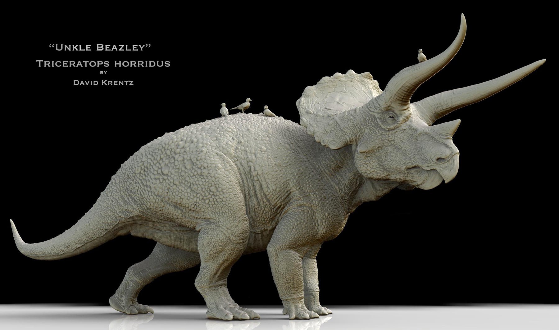 "This sculpture depicts a full grown male Triceratops horridus standing in a strong but simple pose. It is not based on any one fossil specimen but I looked at many very closely. I wanted a piece to go alongside my T.rex named Regina Mundi that would be a response to her menacing pose. Given how much horn length I gave this dinosaur (like Yoshi’s Trike) I thought the Triceratops really wouldn’t be all that intimidated. I thought a “go ahead… try it” pose and facial expression was the way to go. It took a lot of willpower NOT to give Uncle Beazley a dynamic pose, as that would have negated the confidence and indifference I was going for. As reference, I used actors like Walter Matthau (who always look unimpressed), and Johnathan Banks’ character Mike Ehrmantraut from Breaking Bad and Better Call Saul. He has the icy stare of an old vet that tells you he’s seen it all. For animal reference, I used a water buffalo, a hippo, and of course… a rhino. To add scale and a natural element, I thought adding the birds Cimolopteryx to his back and horn would do the trick.